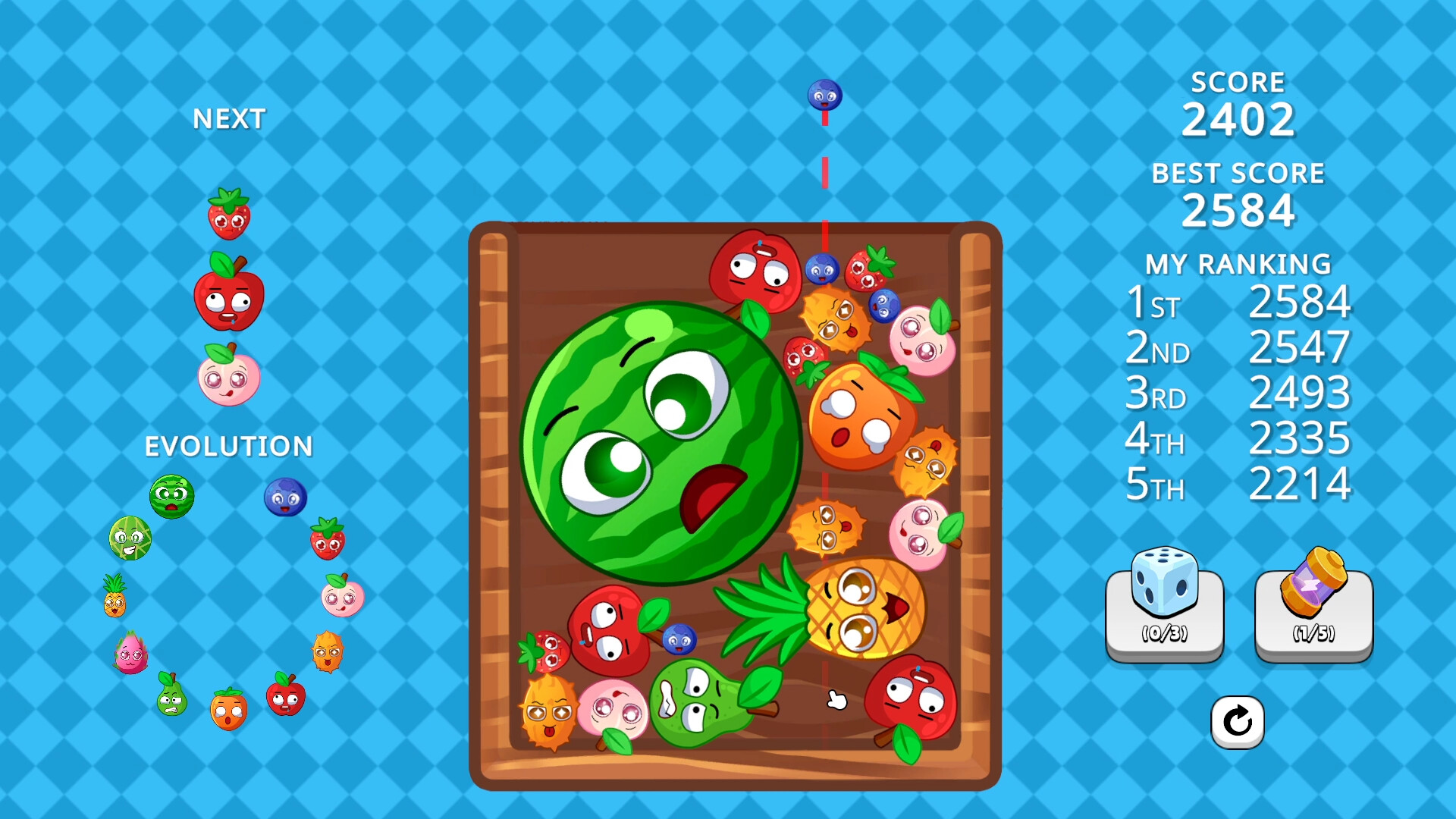 Start with small fruits and combine them to grow your collection step by step. Follow the full evolution path from Blueberry all the way to Watermelon and push your score higher with every perfect merge.