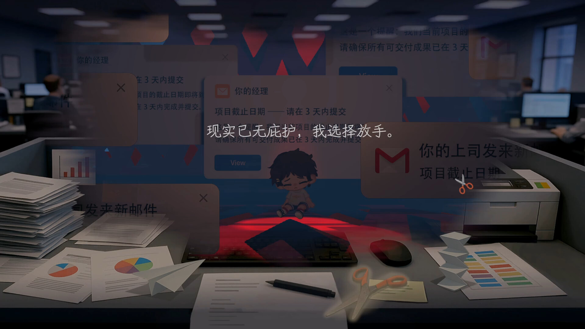幻想逐渐崩塌,主角在理想与现实的撕扯中情绪濒临崩溃。