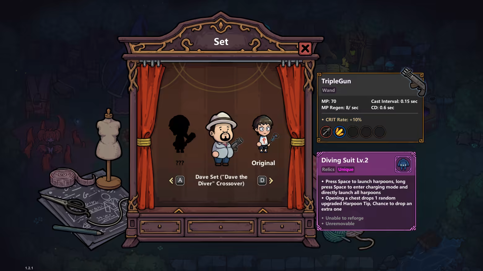 New Set: Dave — starts with the unique weapon TripleGun and comes equipped with the new spells Triple Projectile and Harpoon.