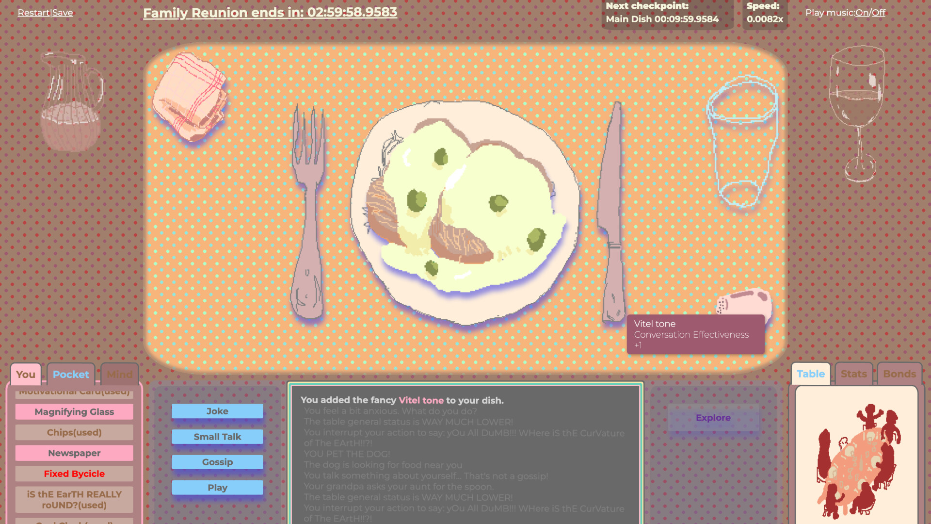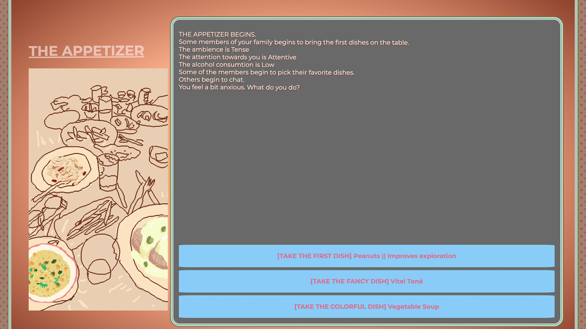 Choose between three archetypes — Introvert, Chatty, or Adventurer — each offering a different way to survive the dinner: through imagination, conversation, or exploration.