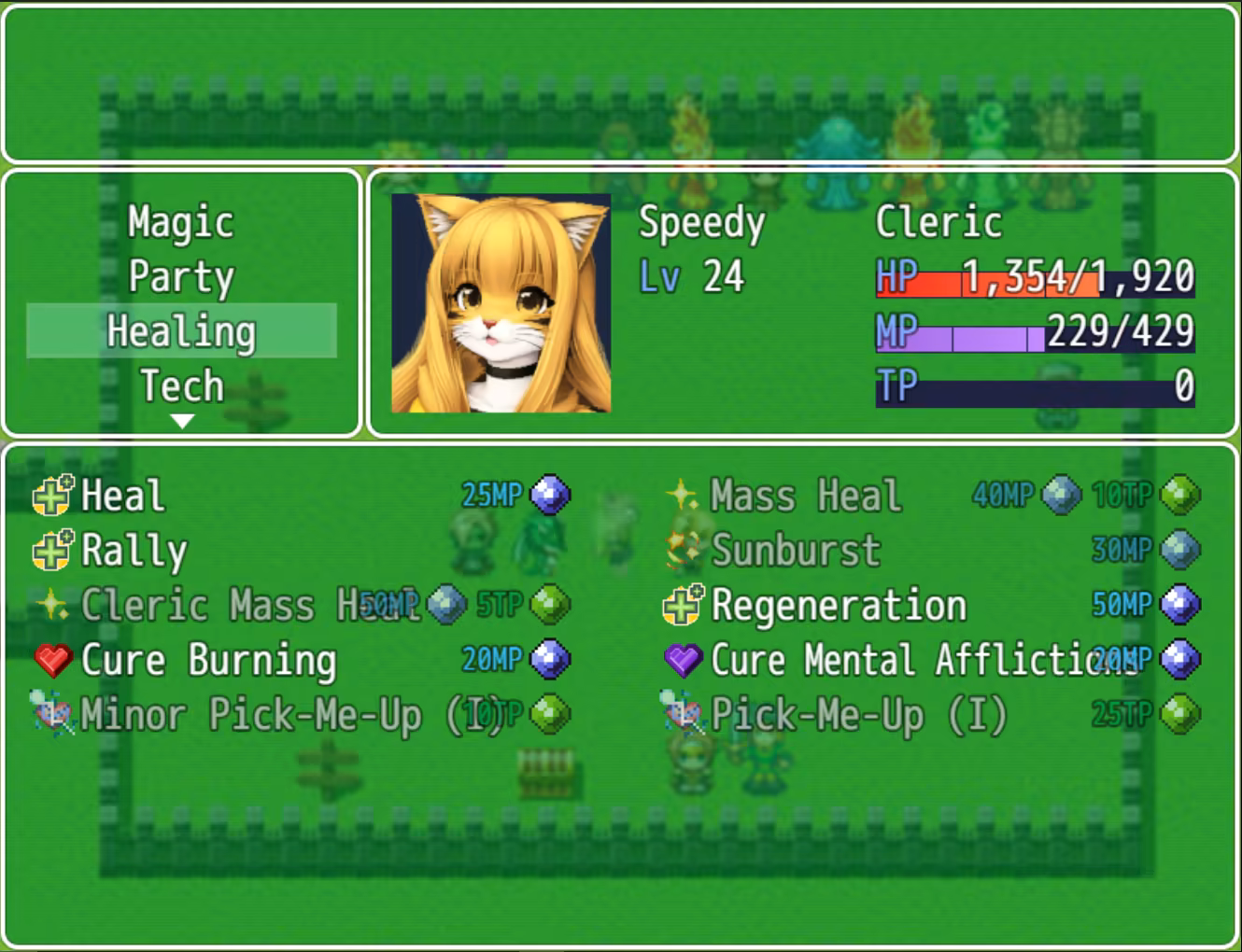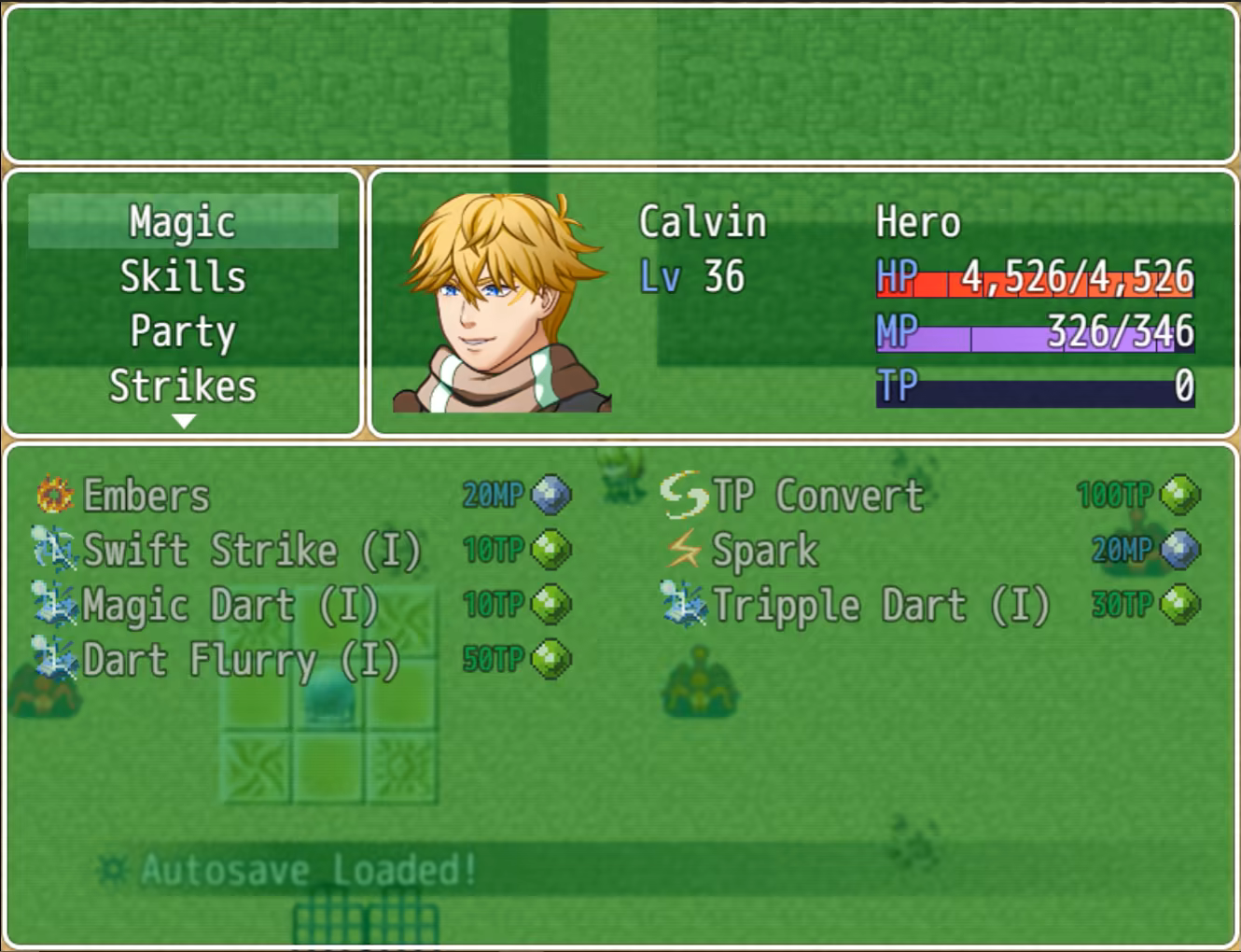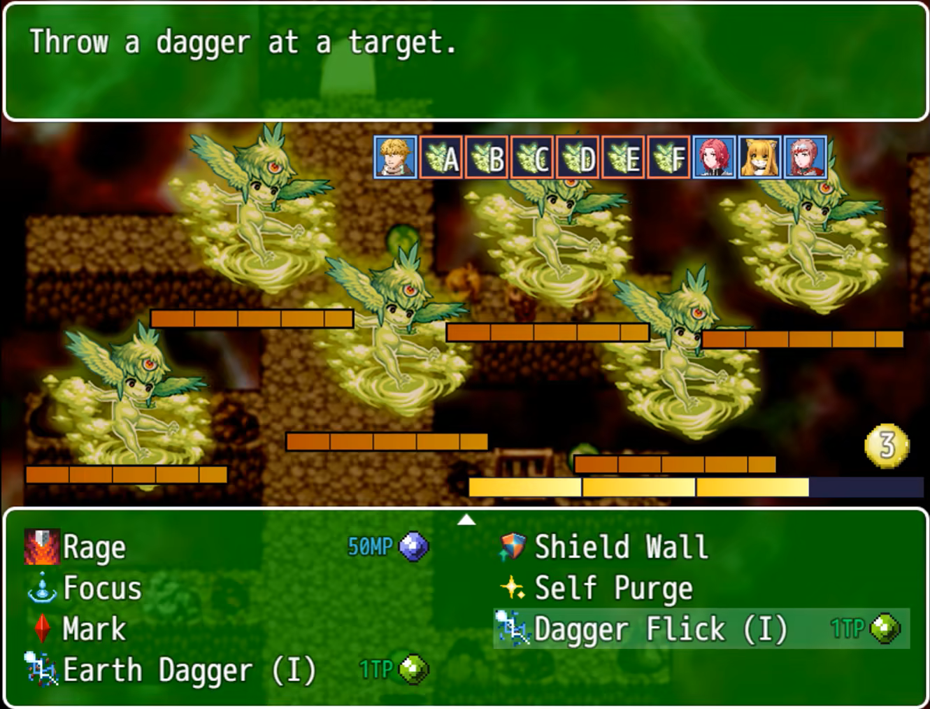 Calvin's Gallery features turn based combat with a wide range of skills, items, and status effects. Instant skills add a unique depth to each fight, allowing both you and the enemy to act multiple times as long as you have the TP and MP. Agility determines your place in the turn order and many skills have a speed rating as well that affects when you are able to act. Spells are usually slow, sword are fast, try out different combinations and explore the skills you learn to figure out what works the best.