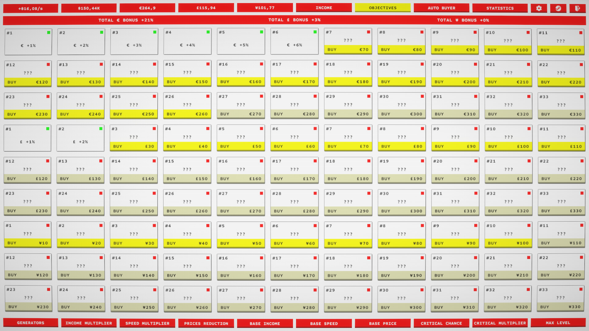 You start with 99 income generators. Optimize your profits by upgrading each one individually. Use up to 10 special prestige upgrades per generator by performing a localized reset. Invest in special currency generators and find the optimal strategy to complete every goal and challenge!