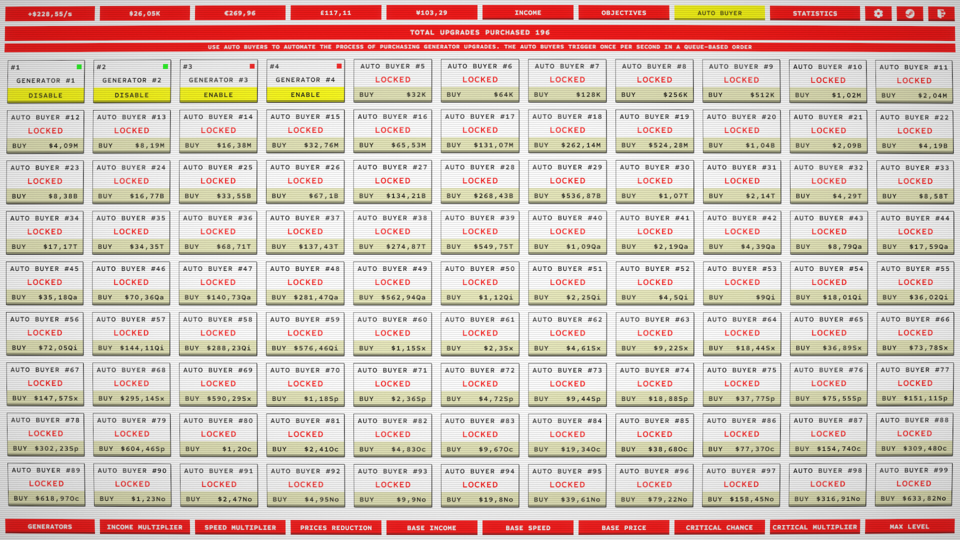 You start with 99 income generators. Optimize your profits by upgrading each one individually. Use up to 10 special prestige upgrades per generator by performing a localized reset. Invest in special currency generators and find the optimal strategy to complete every goal and challenge!