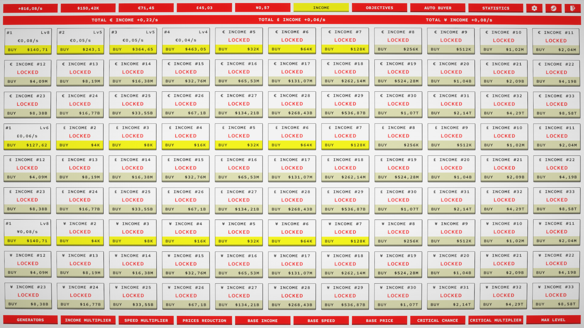You start with 99 income generators. Optimize your profits by upgrading each one individually. Use up to 10 special prestige upgrades per generator by performing a localized reset. Invest in special currency generators and find the optimal strategy to complete every goal and challenge!