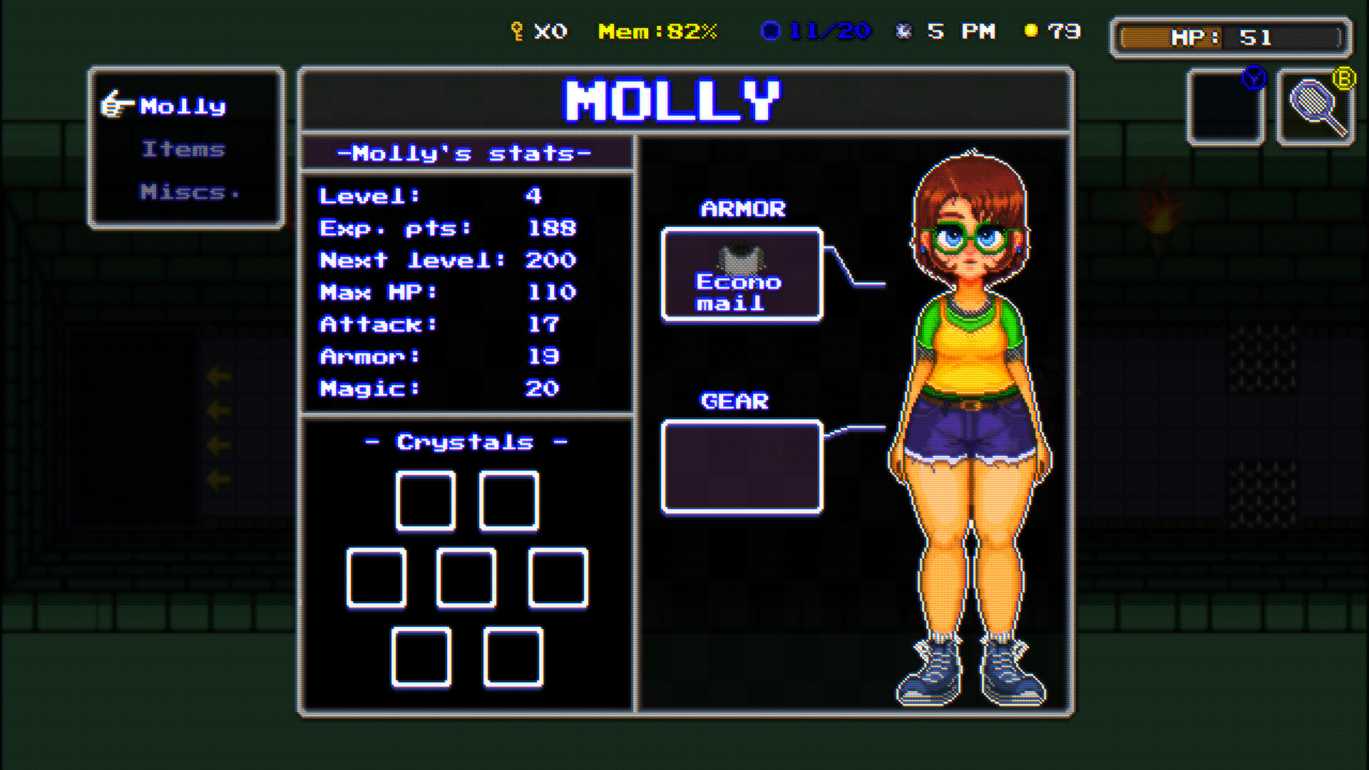 You must keep Molly’s corruption meter low during battles, or the game will start to glitch and her stats will plummet. If the meter reaches 99%, it’s game over! You can fix errors and reduce her corruption, but that costs “memory points”.