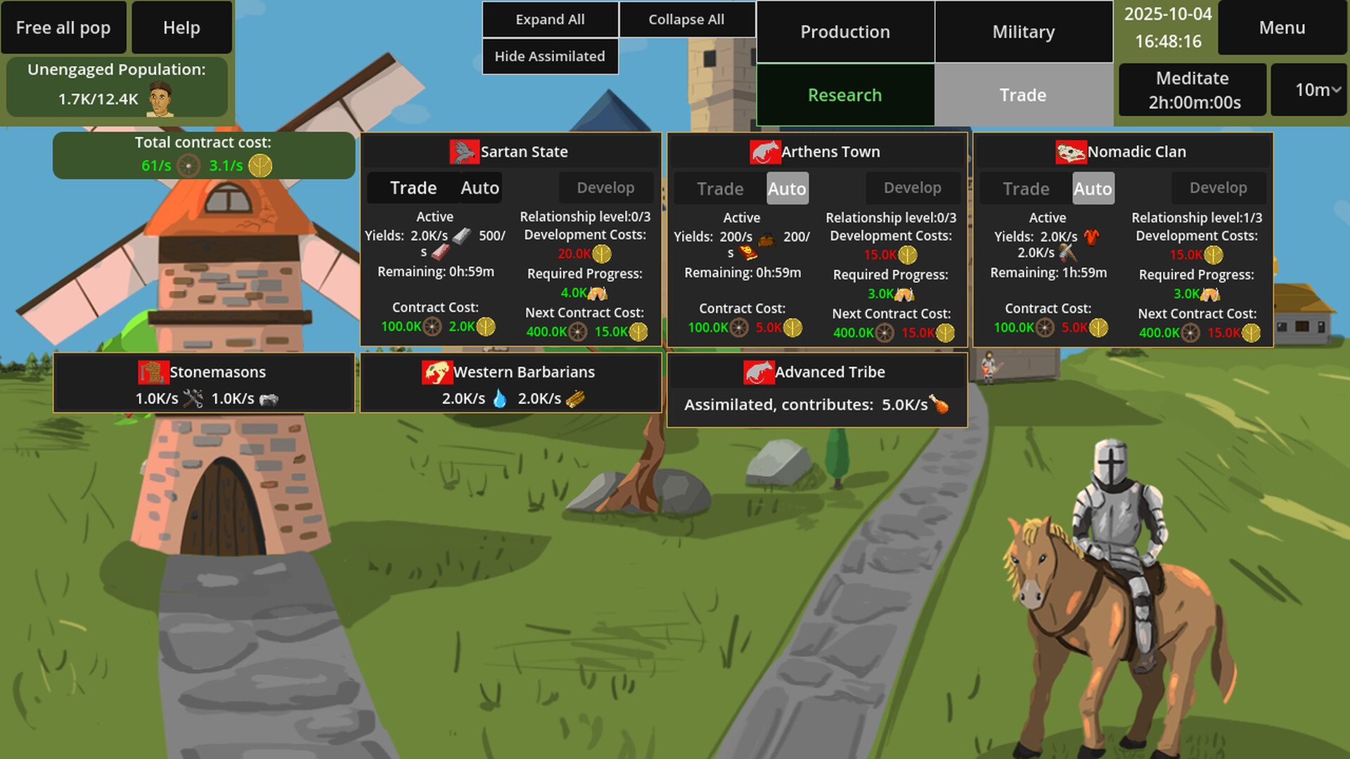 Finally, spend leftover resources to train up your military and attack neighbouring countries, to further upgrade your output with extra space as well as learn new methods of production from them. Battles are resolved in the autobattler fashion, where strengths and weaknesses of your units are clashing with those of your opponents.