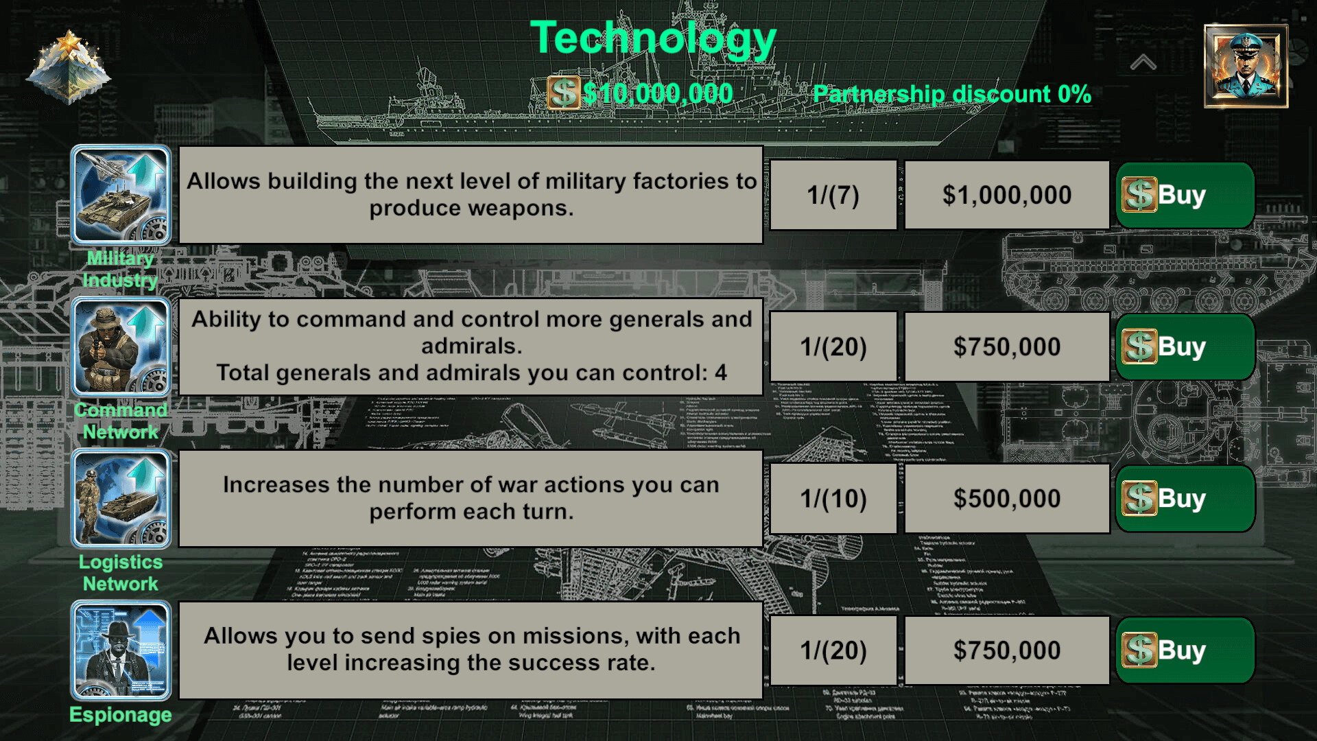• Advanced espionage options: Disrupt Communication, Bribe Generals, Steal Money, Frame a Country, Rig Elections, Infiltrate War Rooms.