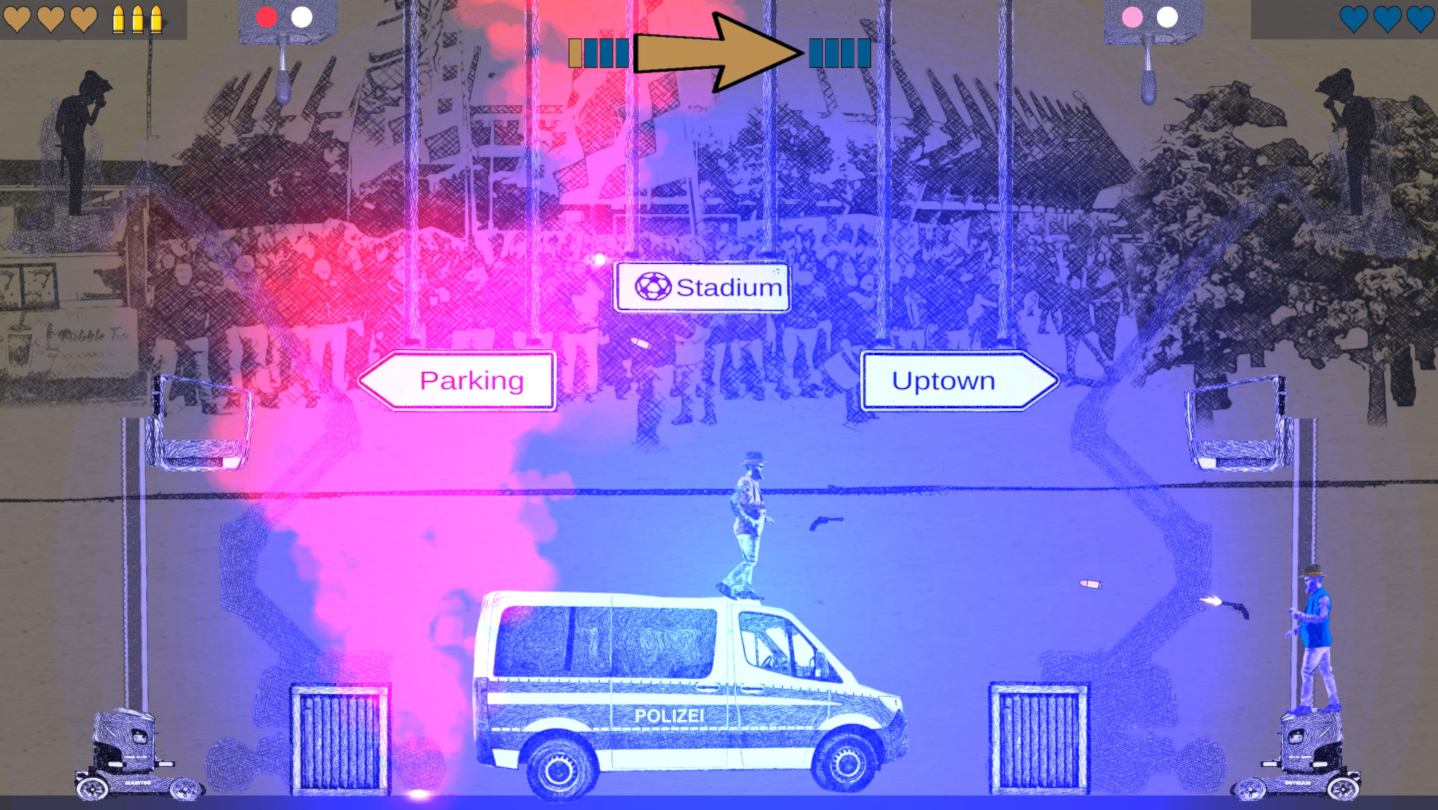 To gain your turn, you can shoot directly at your opponent, use your fists at close range or you can shoot the interactive world objects. In that way you can attack your opponent with things like wasps, bottles from celebrating people, police water cannons, or pyrotechnics from football ultras.