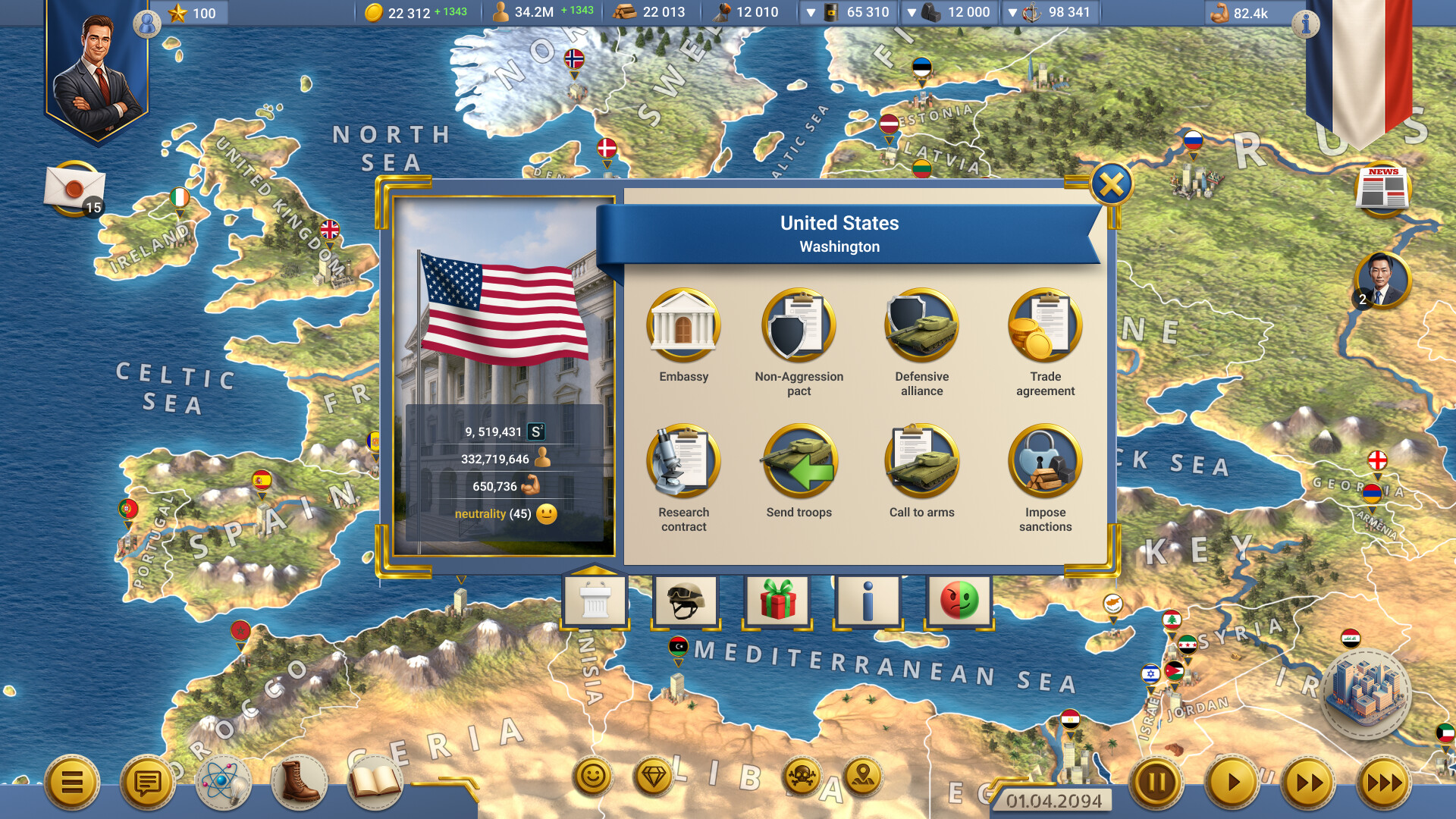 Find friends among other countries, join international organizations, sign non-aggression pacts, defense alliances, trade and research agreements, open embassies. Vote in the UN and the UN Security Council, impose sanctions, and propose resolutions for voting