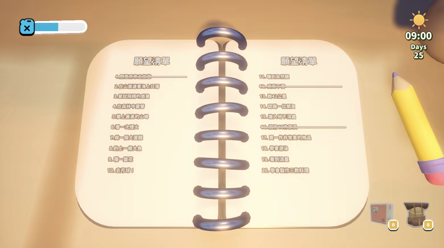 願望清單上列滿了大大小小的目標(有些甚至有點奇怪),在這趟旅程中嘗試完成它們,這樣也許就能抵達這個世界的終點。