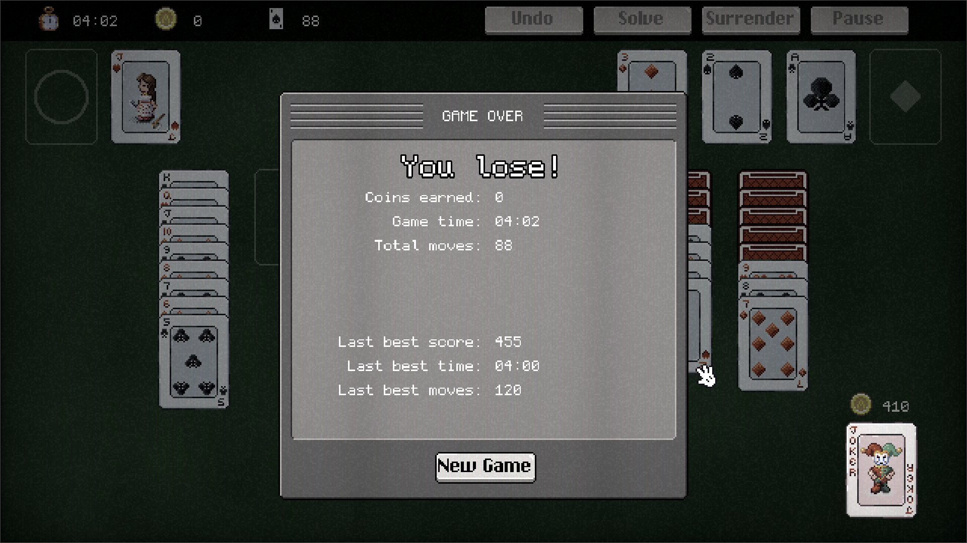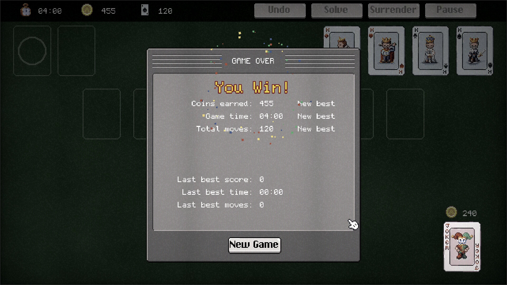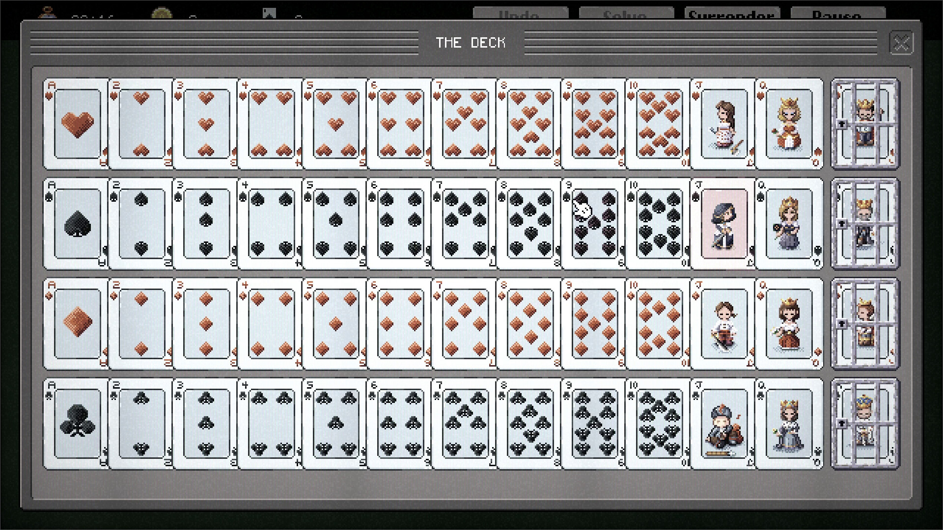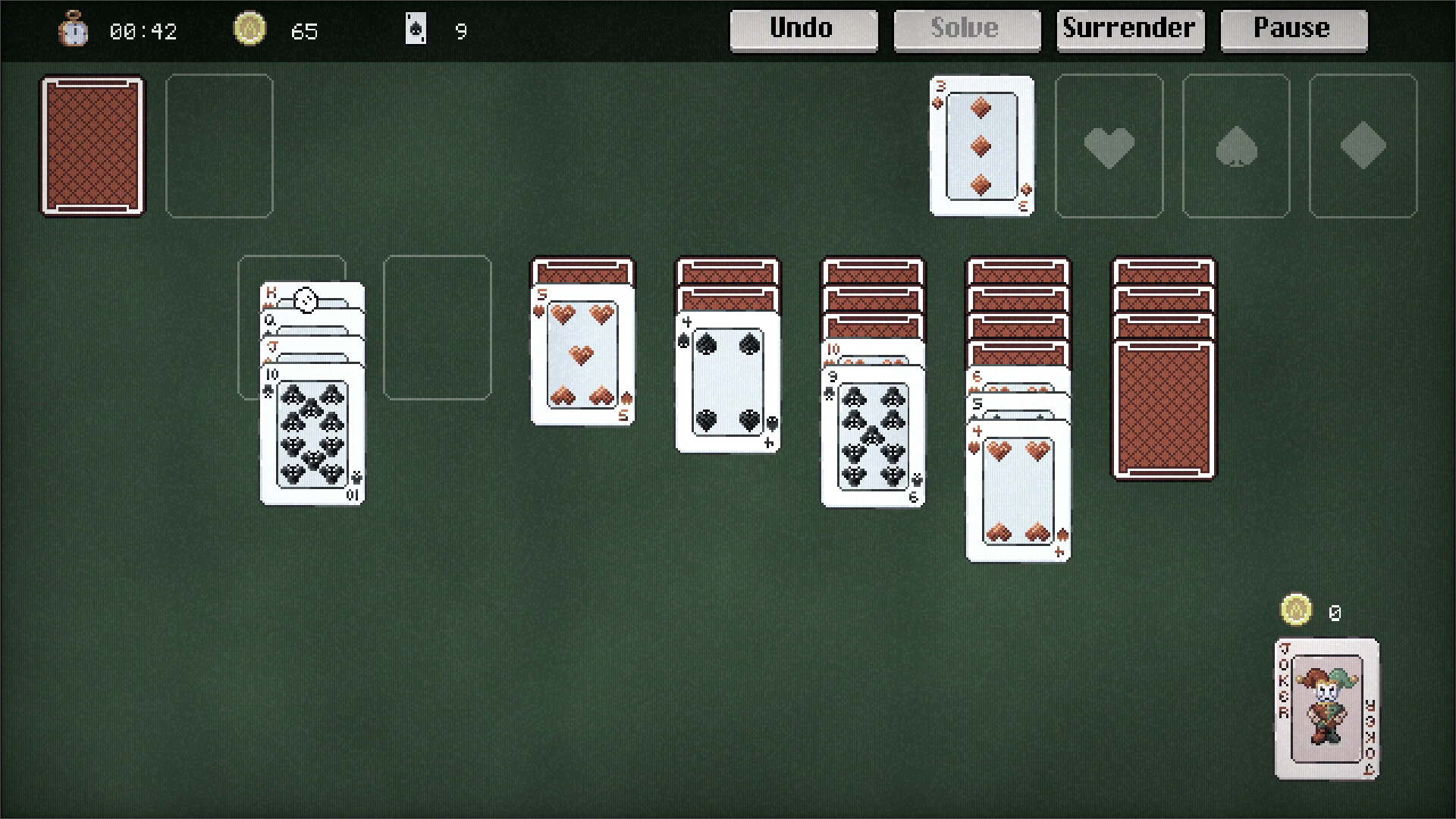Retro Klondike solitaire with nostalgic pixelart. 52 cards, 1 Joker, classic rules. Progression, achievements, original music. All normal. Everything as usual. Right?