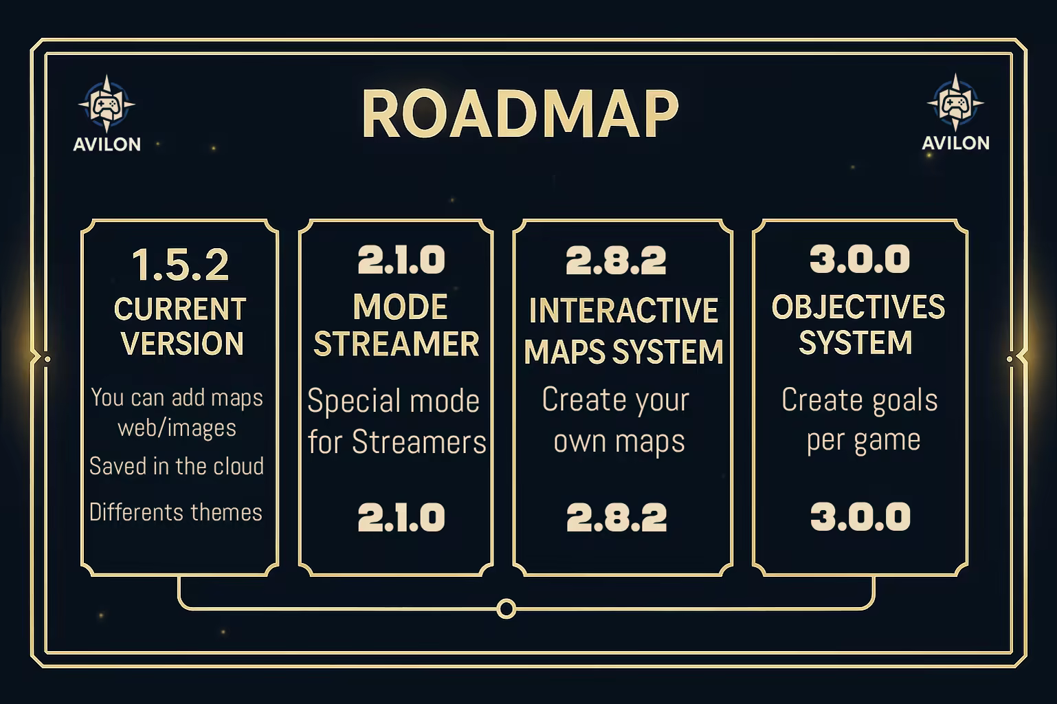 The project is constantly evolving to ensure proper use and to add new features. Keep in mind that AVILON is being developed by a single person, so bugs or errors may be more visible. Nevertheless, I share the roadmap we hope to continue. Your support is very important for the future of AVILON.