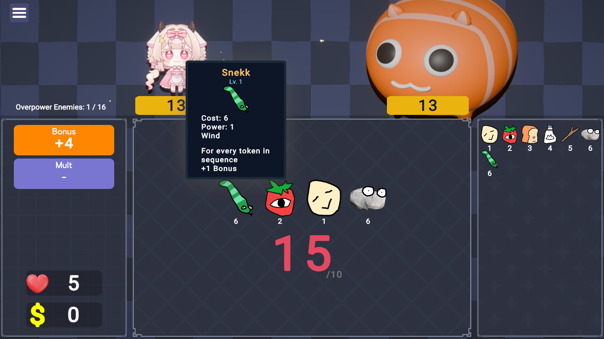 Cream Pie is a turn-based roguelike where you outpower enemies using a sequence of tokens. Roll, watch, and mulligan once per turn to bend the chaos in your favor