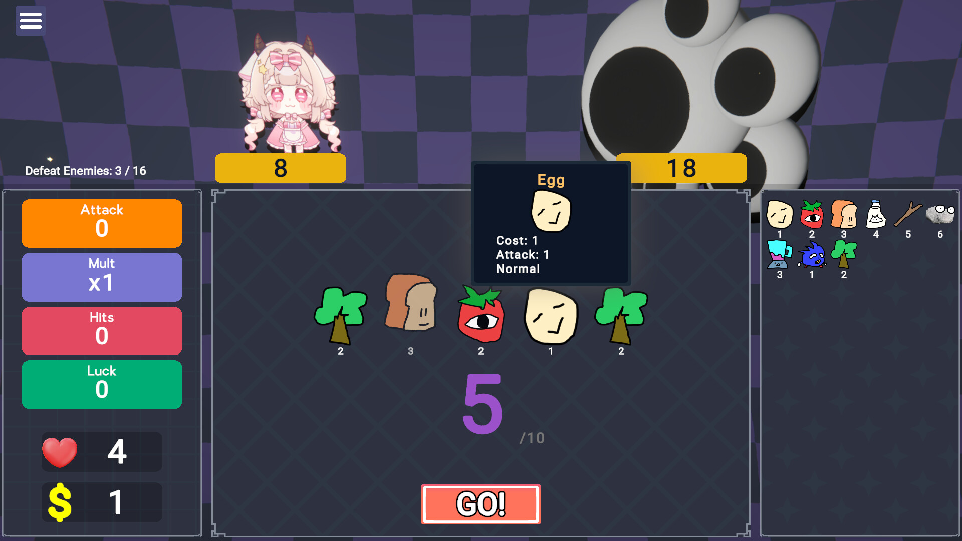 Cream Pie is a turn-based roguelike where you outpower enemies using a sequence of tokens. Roll, watch, and mulligan once per turn to bend the chaos in your favor