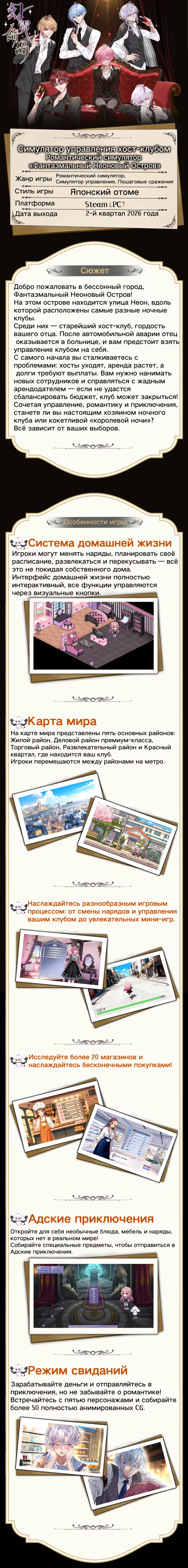 Добро пожаловать в бессонный город, Фантасмальную Неоновую Остров! Вы наследуете хост-клуб от отца после его госпитализации. Сталкивайтесь с уходом хостов, ростом аренды и долгами. Нанимайте новых сотрудников и ведите клуб — успех зависит от ваших решений!