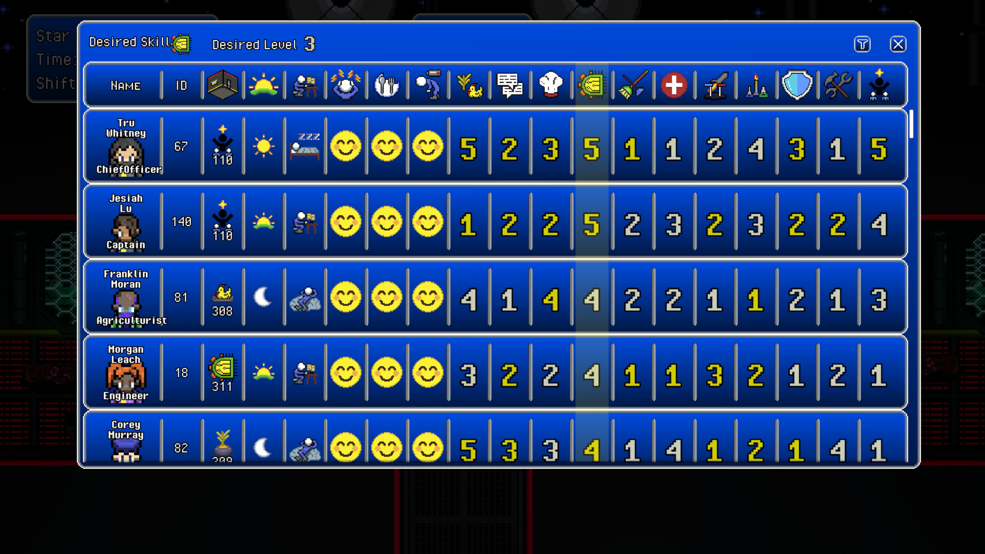 A large part of your responsibilities will be to manage the crew's performance. Some crew members will have hidden talents that will suit them for a new role. Others may be complete novices at a particular job but have a high potential for growth if you let them build experience. You will have to balance what assignments are optimal now, versus which could unlock advantages over time.