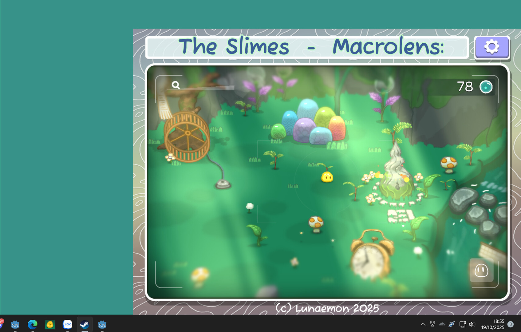 Macrolens: The Slimes simulates a camera’s perspective observing a slime in a small garden. The yellow slime plays mini-games to collect Earth Energy. With its cute visuals, the game can sit in the corner of your screen and includes a Pomodoro timer to help you relax and work more efficiently.