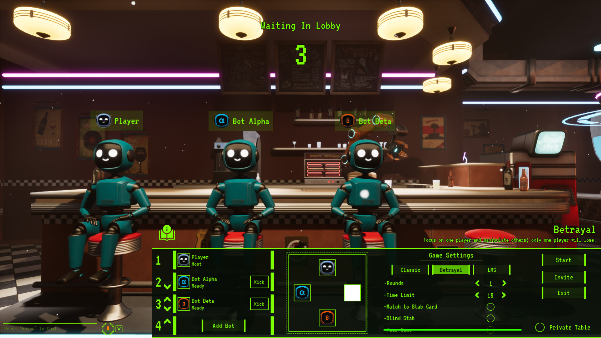 Whether you’re playing with online friends or AI Stab Bots, Stab Club offers a unique mix of strategy, deception, and competitive fun. Stylized visuals and subtle effects create a memorable, immersive tabletop experience.