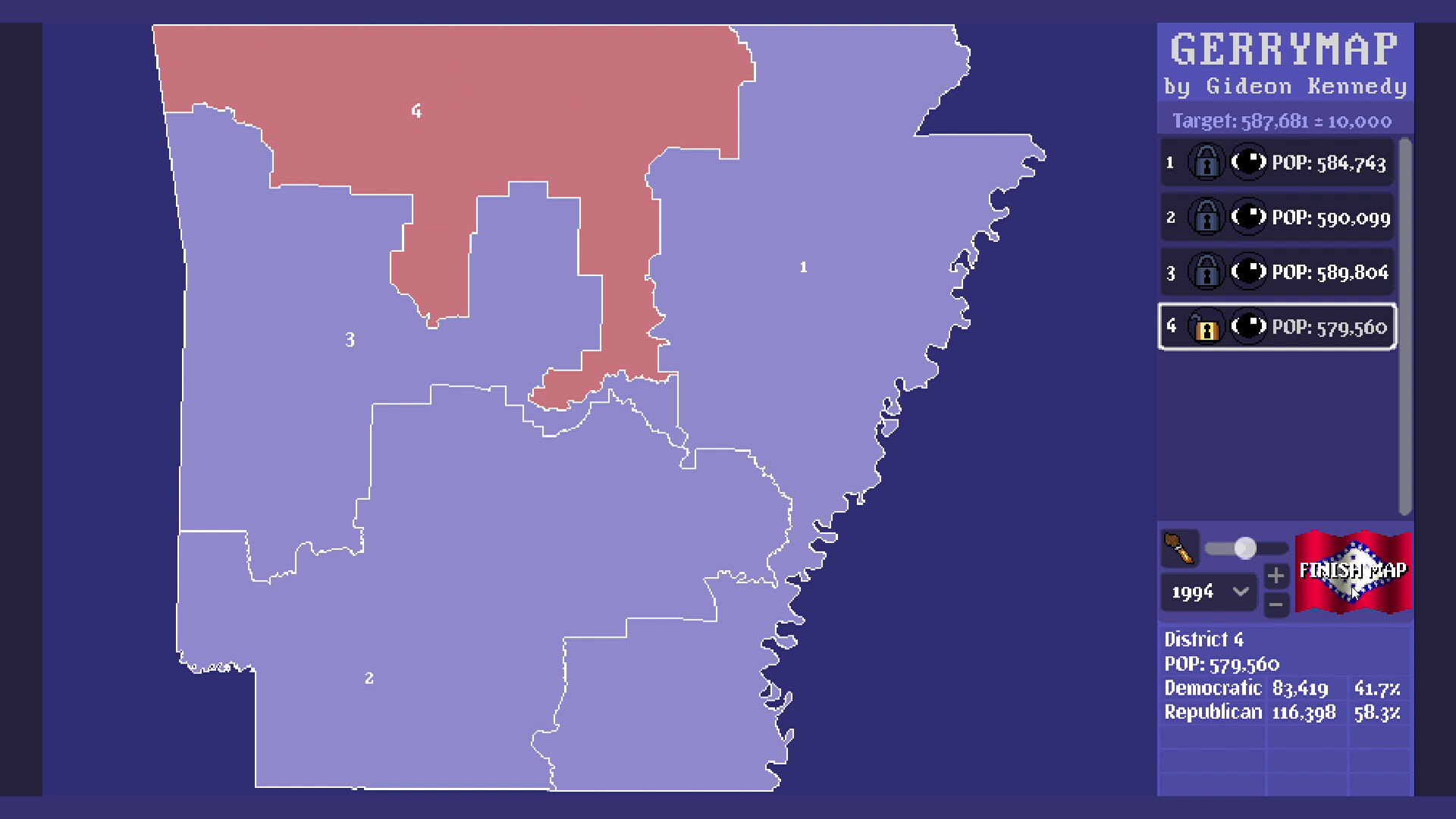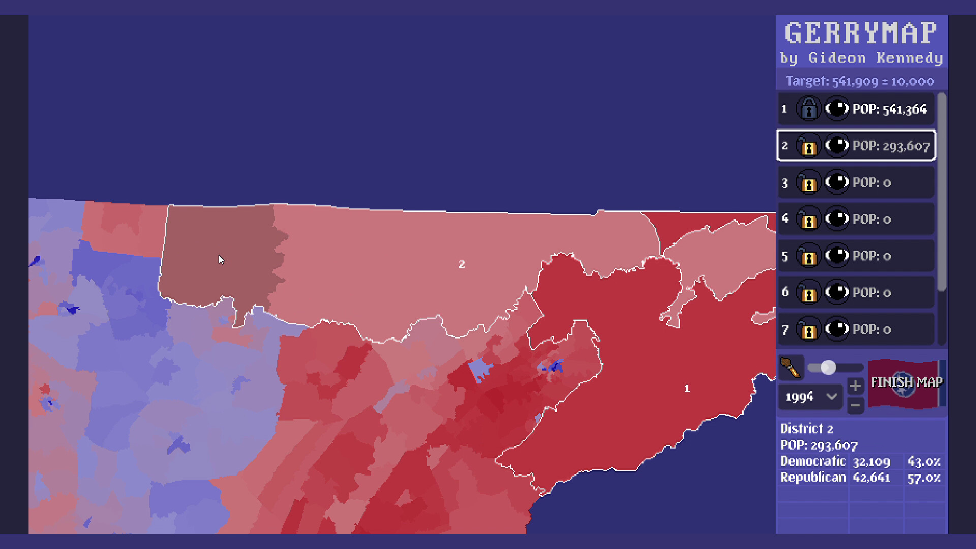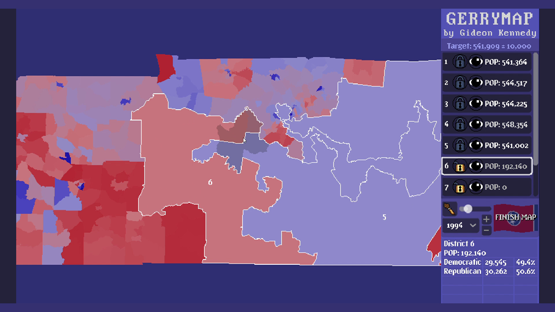 Gerrymap is a game about gerrymandering. Your goal is to draw the maximum amount of districts where your voters are in the majority, utilizing real census and election data.