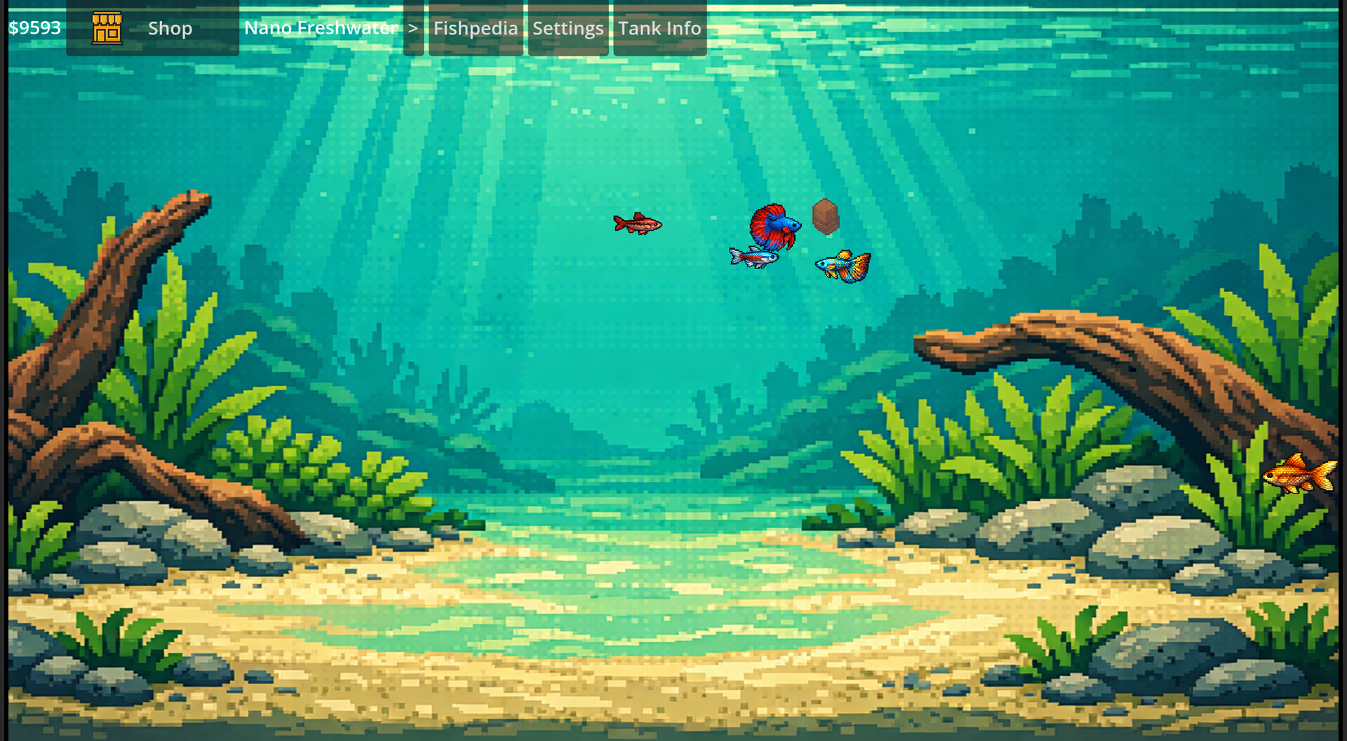 Buy egg packs from the shop, watch them sink to the tank floor, and crack open to reveal random species. Feed your fish to grow them from tiny hatchlings to full-grown adults, then sell them for profit or keep your favorites locked away in your collection. Every fish has its own swimming style, speed, and personality.