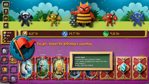• Starting Core Loop: Begin the game by clicking to defeat monsters and earn Gold. Spend your hard-earned Gold to acquire new cards and boost your damage output.