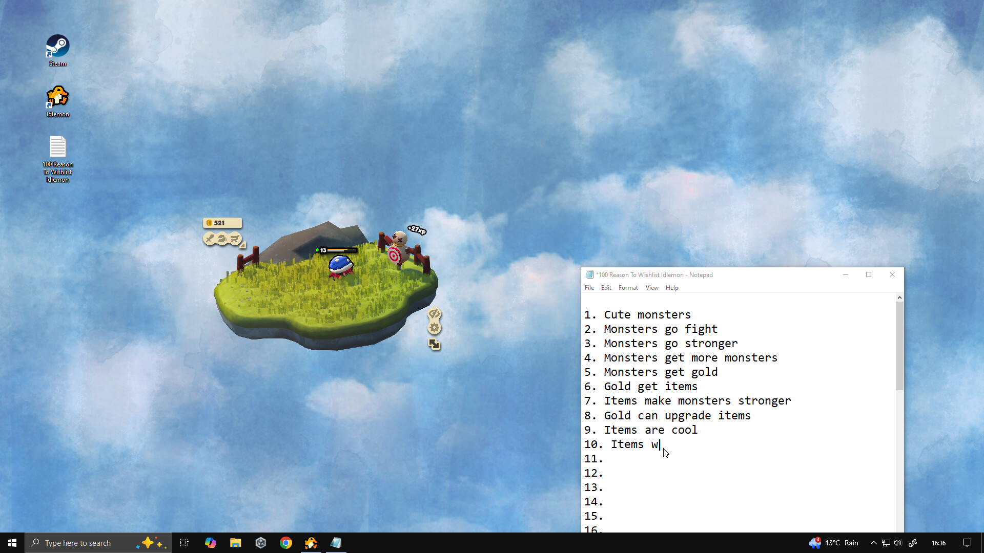 Idlemon은 데스크톱에서 즐길 수 있는 방치형 몬스터 트레이너입니다. 화면 옆에서 플레이하면서 몬스터들이 경험치를 얻고 레벨업하며 점점 강해집니다. 다른 몬스터와 싸우고, 골드를 모으고, 아이템을 구매하며 새로운 훈련 파트너를 만나세요.