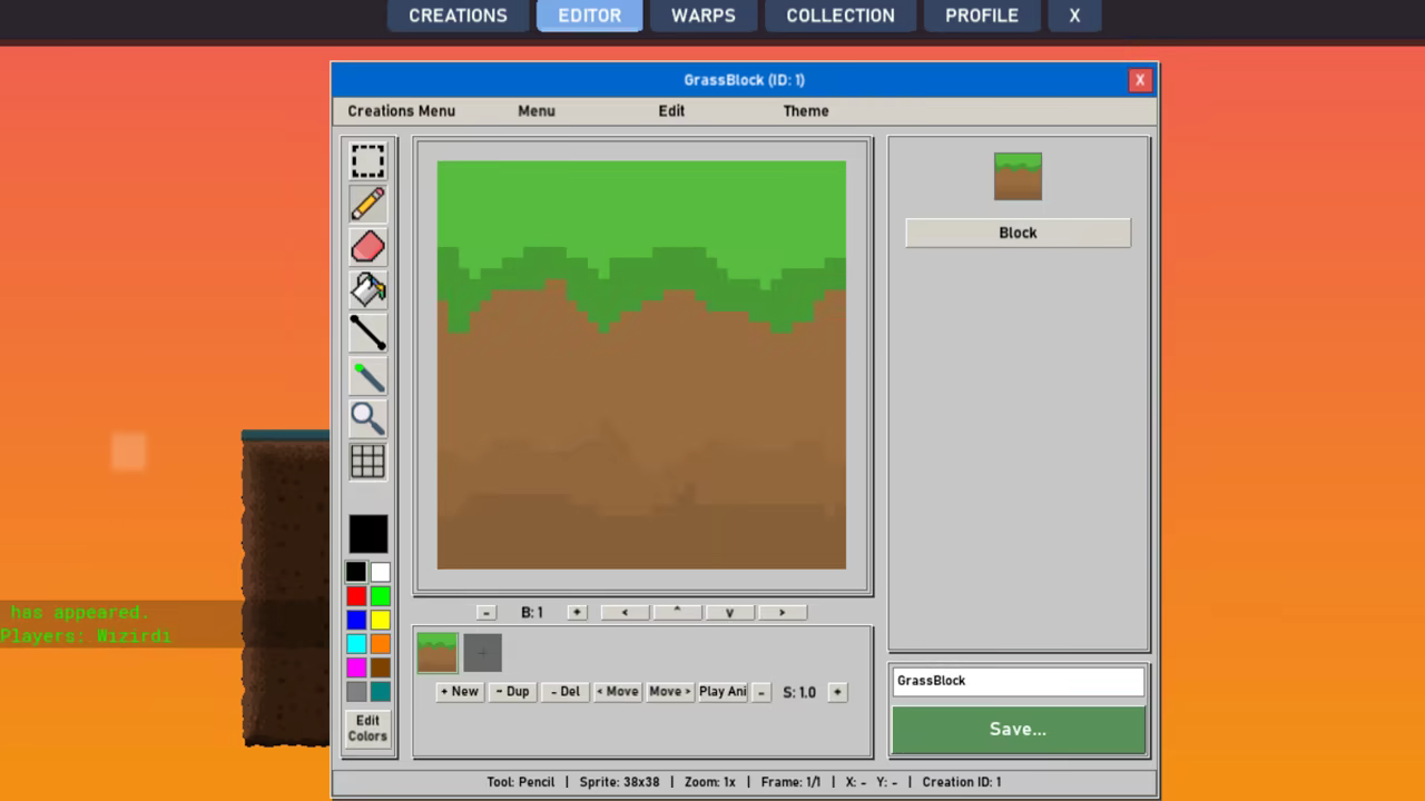 Design everything right inside the game! Blocks, skins, wallpapers, sound effects, ladders, liquids, emojis & more! Create animations frame by frame, paint pixels freely, and edit your creations at any time. Place creations into the world to design the game world with other players!