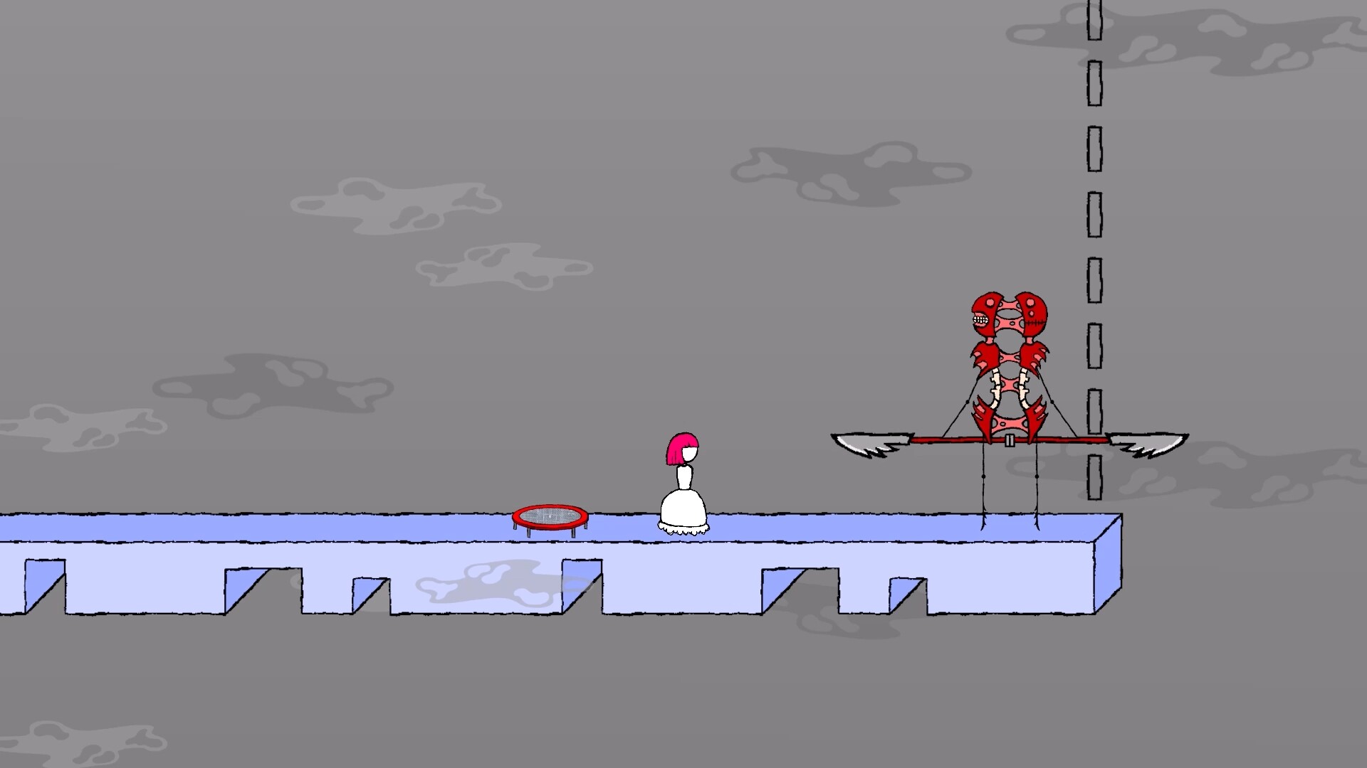 The setting is absurd and surreal: an aseptic void embraces the domains of the archetypes, places that reflect the identity of their rulers. Along your path, you’ll encounter flames, spikes and chasms, but also balloons and trampolines. In these locations, Miss M. will have to solve a mysterious kidnapping case.