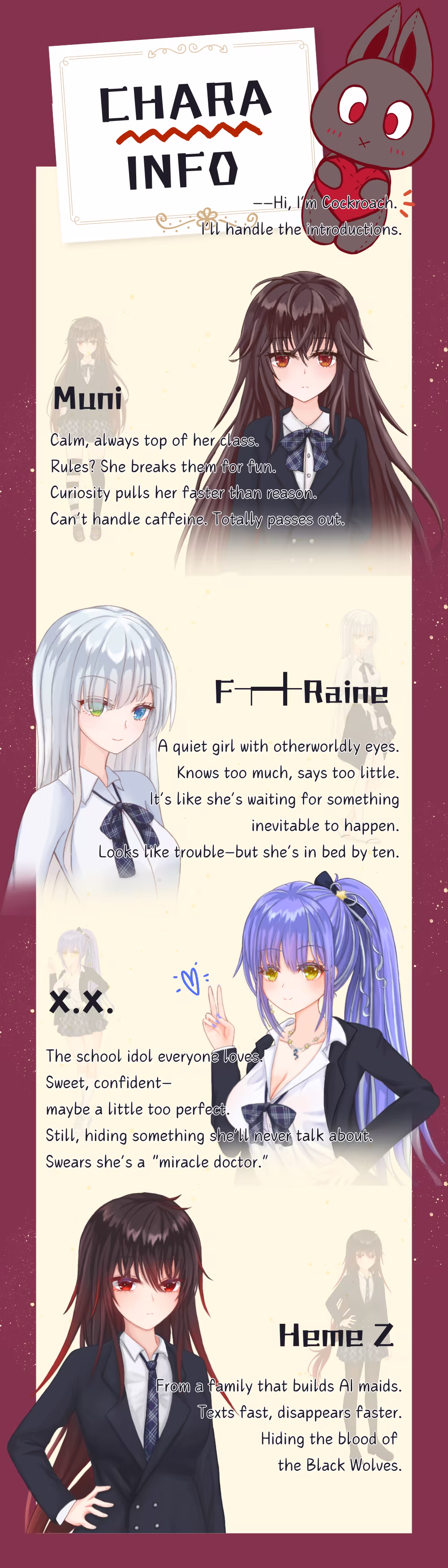 Muni awakens on an unfamiliar campus, drawn into a web of mysteries. Your choices shape relationships and the path of the story. A relationship-driven yuri game.