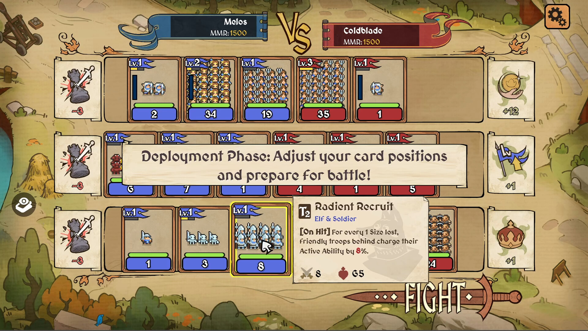 Pick from ever-changing options and shape your roster. Each card is a troop with a unit count that can grow by invesing gold. Some troops fuel your more resources, while others provide raw combat power.