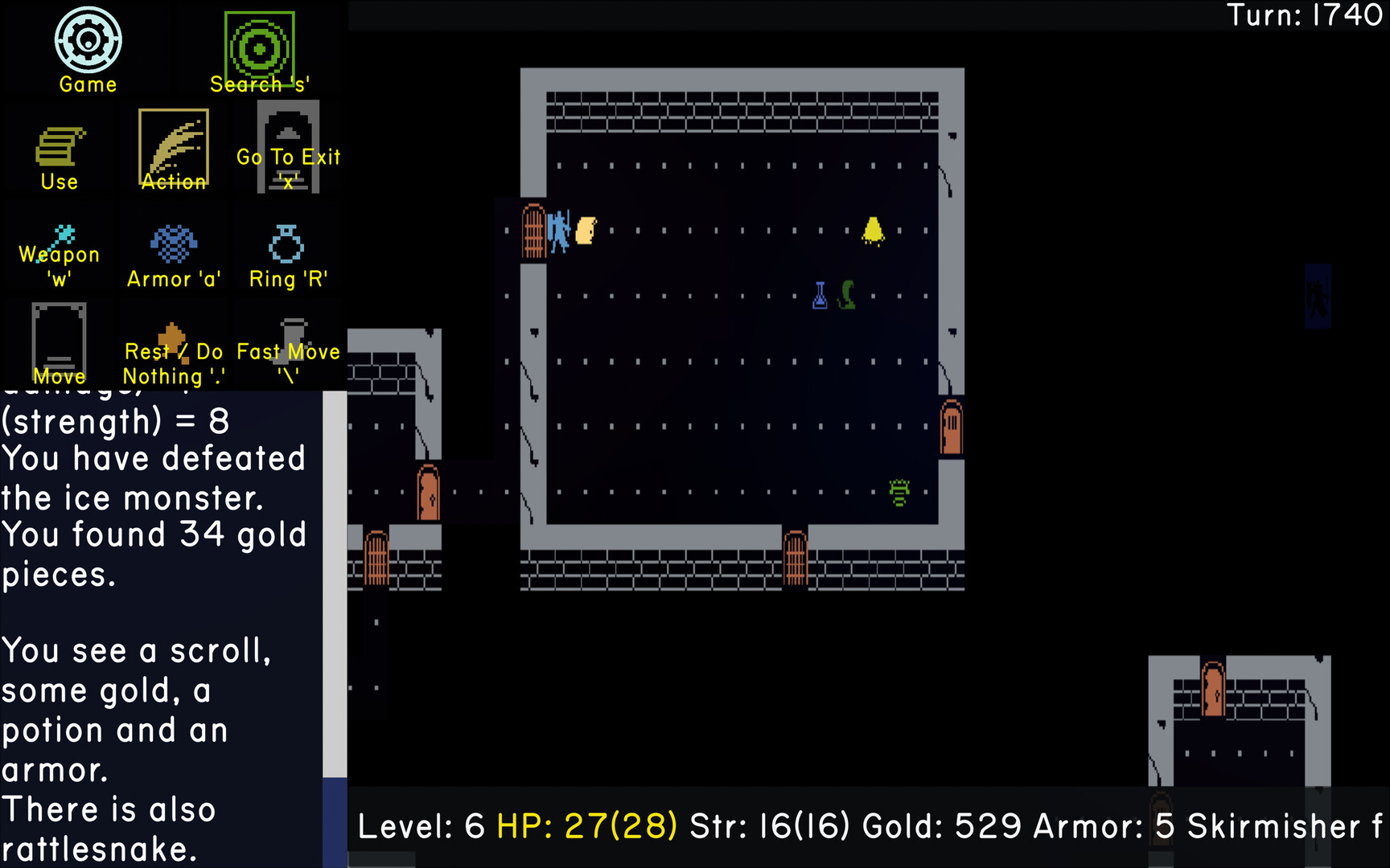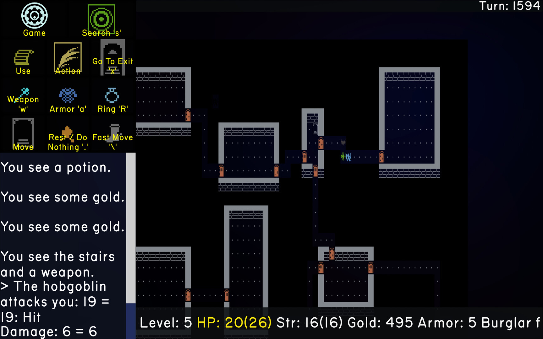 This game was inspired and influenced by the original Rogue - a 'roguelike' genre defining game from the '80s originally played in Unix text terminals - but adds many enhancements and refinements in order to allow for more modern user friendly experience - all while preserving the original feel and gameplay -