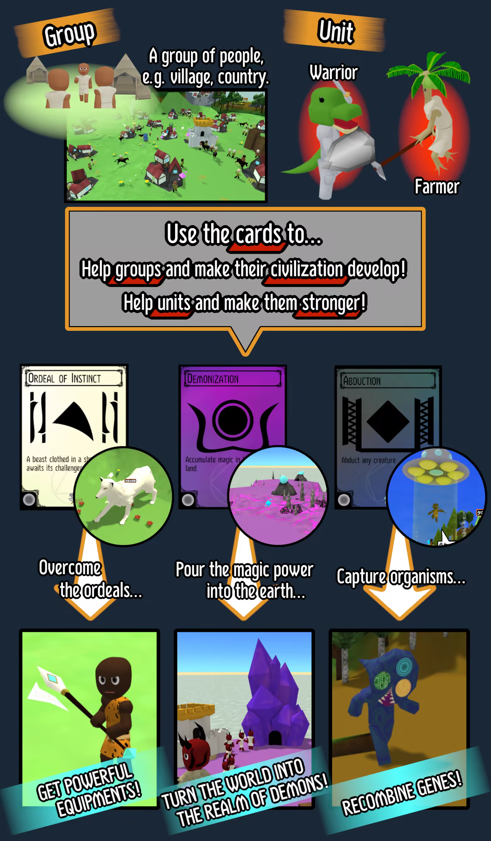 You can influence the world only through the cards. Use three types of cards to expand Groups, advance their development, and guide Units on their path to becoming legendary heroes!