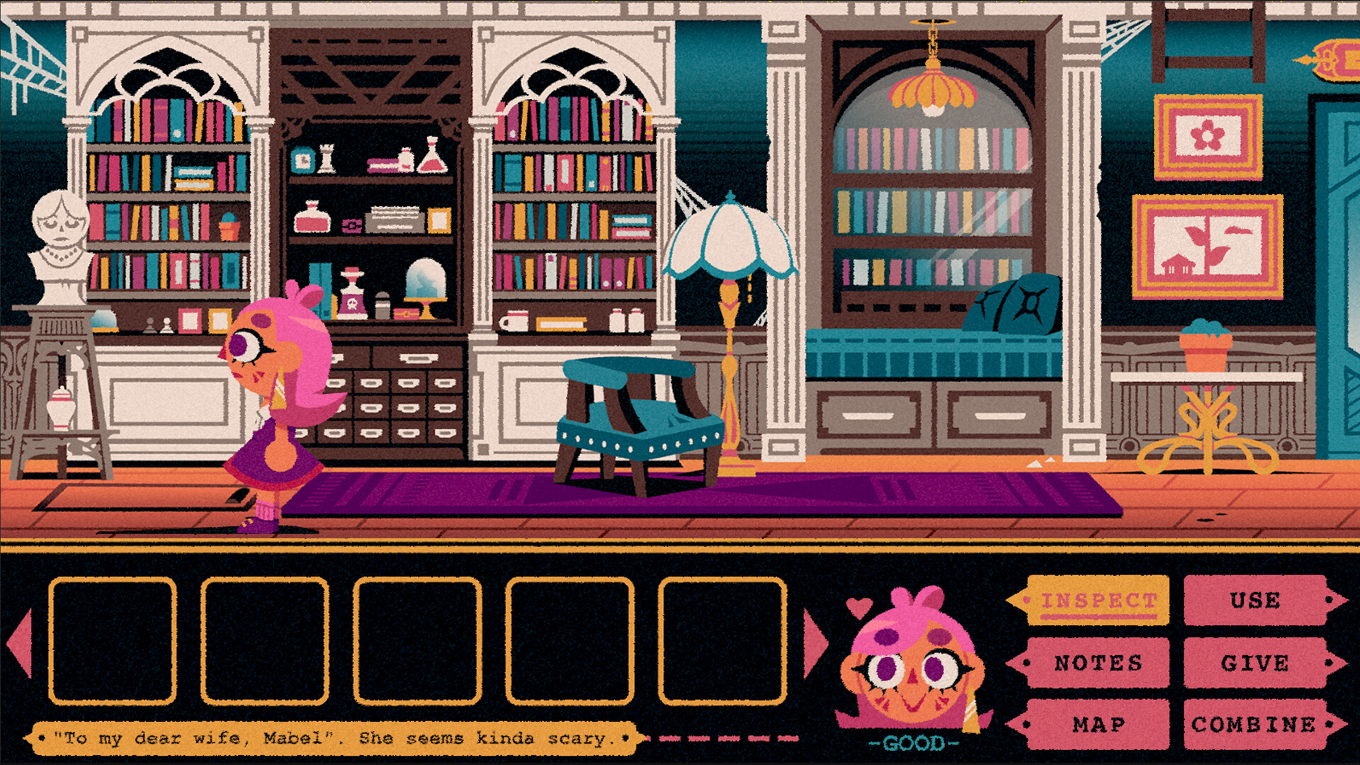 School Night Séance is a modern take on the point and click adventure genre. A pair of best friends; the impulsive Melony, and the practical Letty, find themselves separated in a haunted mansion after performing an ill-advised séance. The girls will need to work together to solve puzzles, uncover the mansion’s mysterious history, and finally, reunite and escape the house!