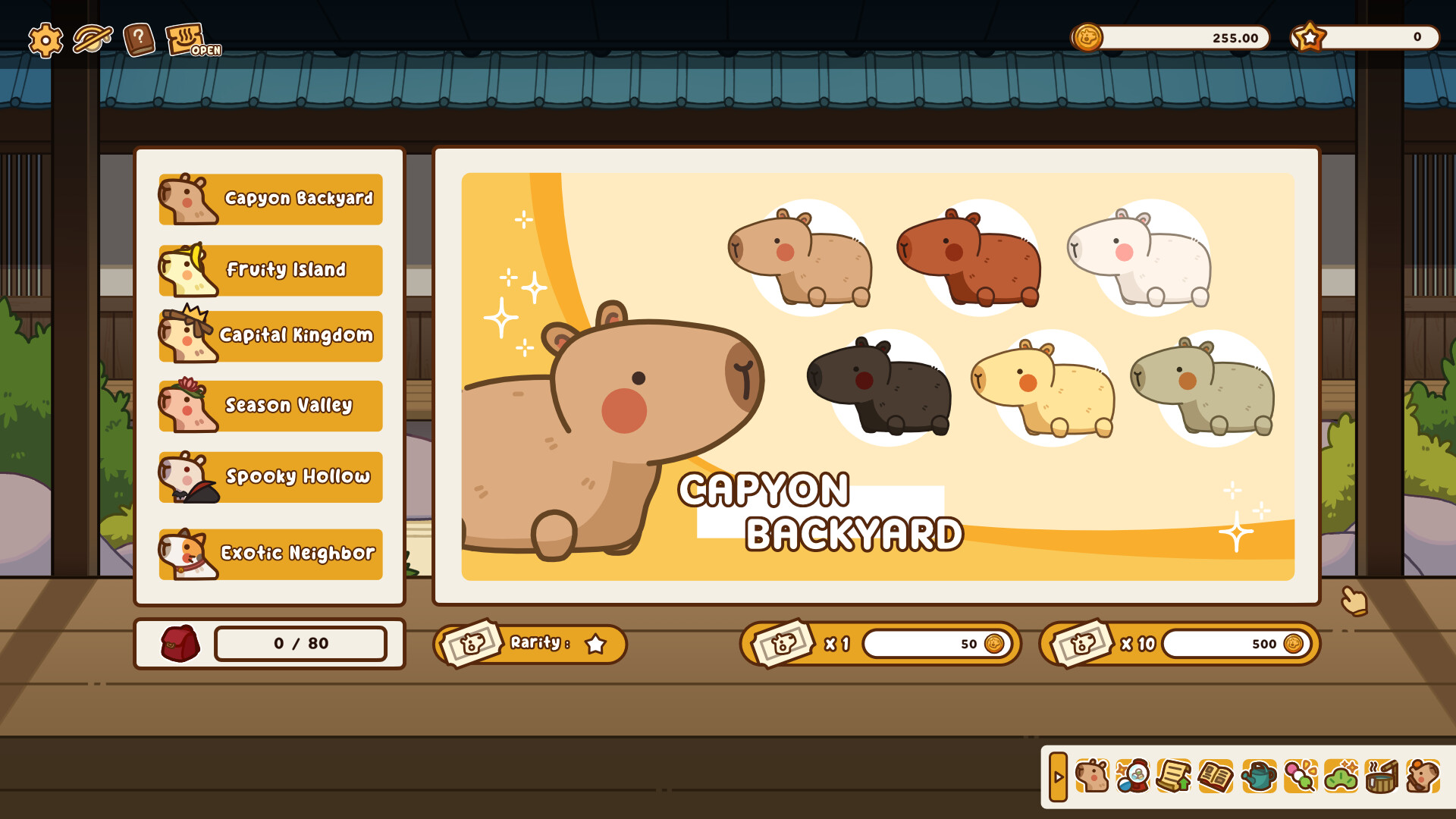 Send out invitations and welcome new friends from various regions to your onsen. There are a total of 36 types of capybaras in the collection, and as you advance further, you can even design your own capybara!