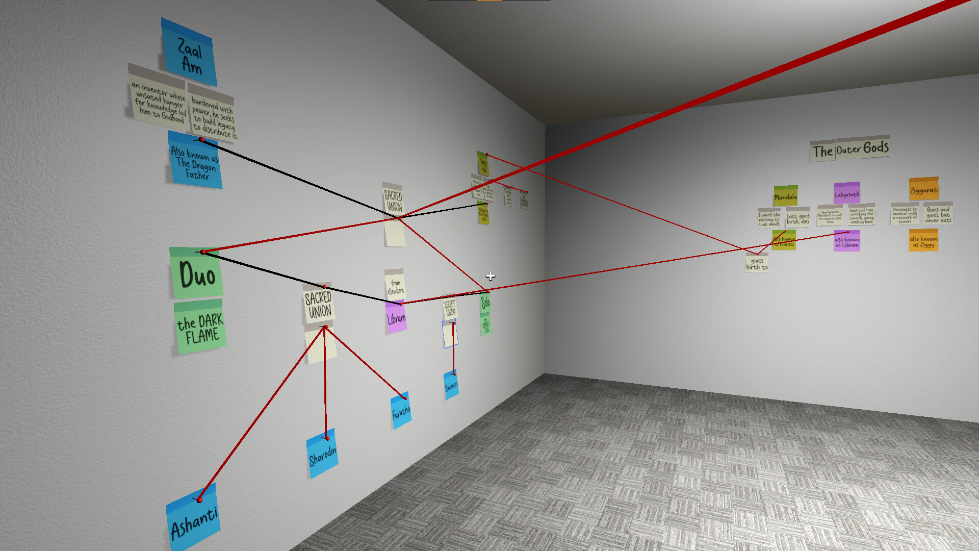 „In it's current state, BrainMess is a VERY barebones mind mapping tool where you can place sticky notes and connect them with strings on the walls, ceiling, and floor of a single room. It is basically a proof of concept.“