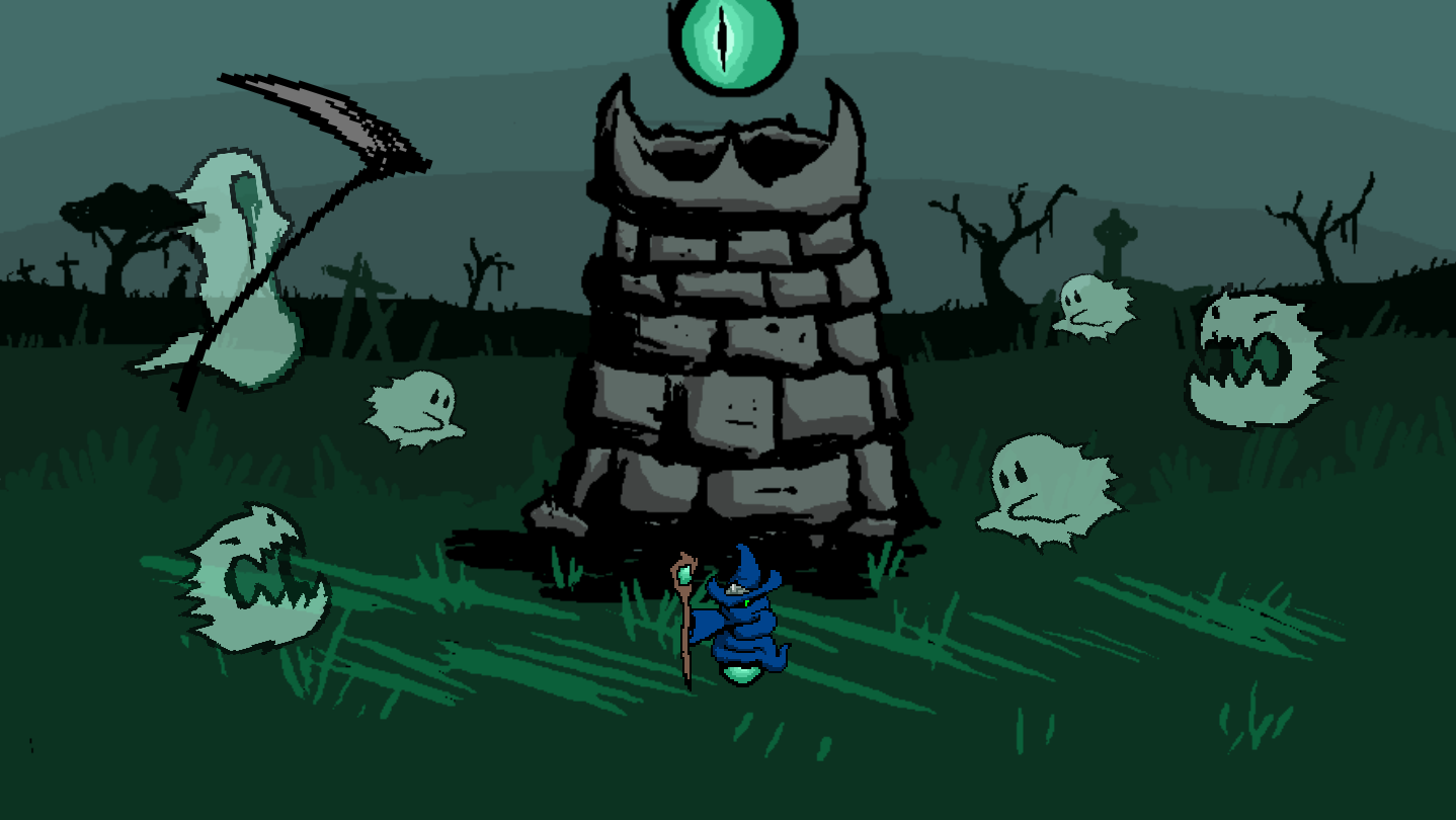 Soulcaller's Tower is a 2D top-down survival game. You must defeat enemies to upgrade your spells, improve your stats like hit points and speed, and upgrade your tower to increase its durability. Your tower has a growing threat radius; damaged enemy structures within this radius will spawn enemies that will attack your tower. Enemies will only target you if you get close enough.