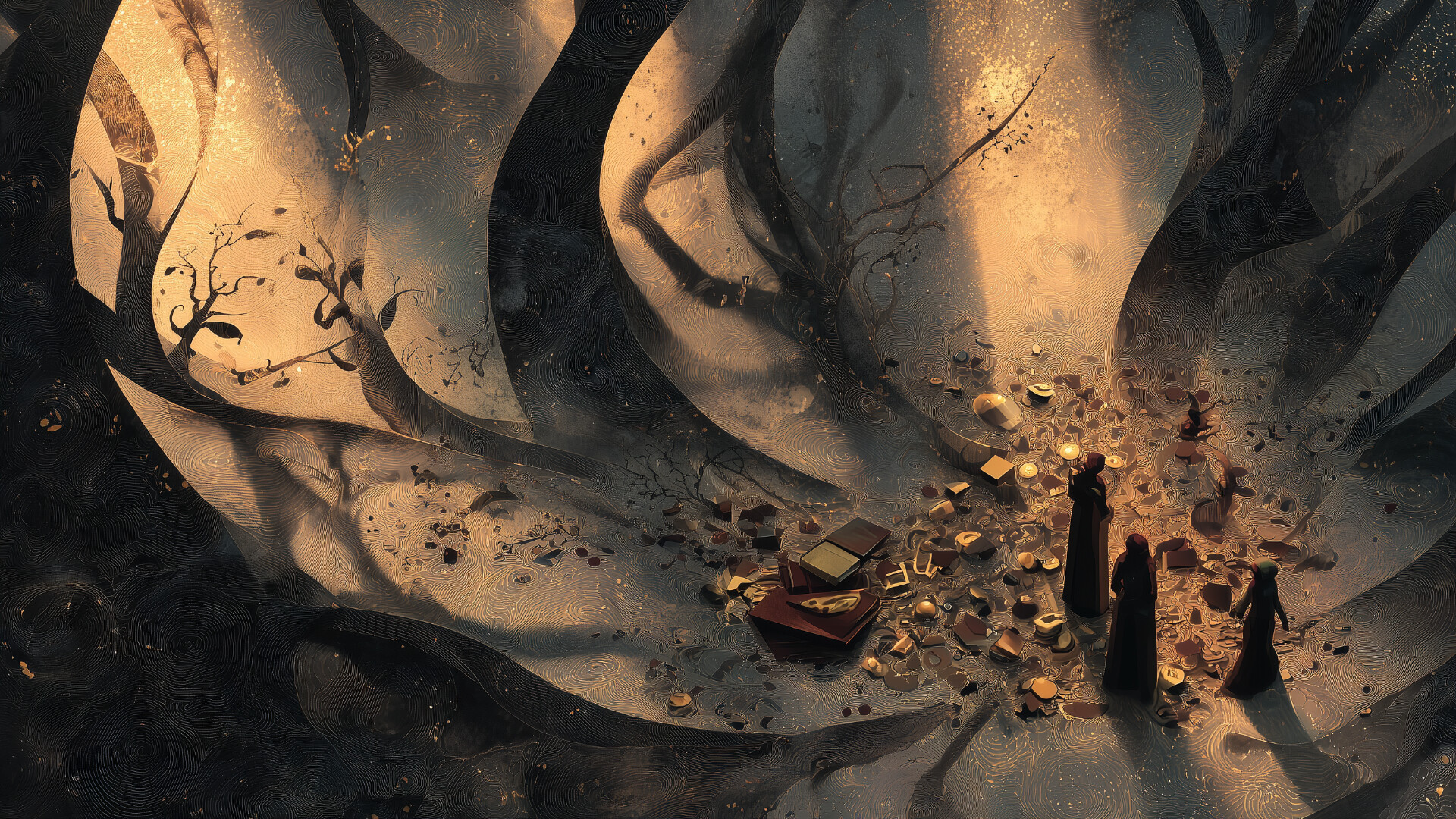 A haunting blend of orchestral ambience, ethereal voices, and ritual drums.