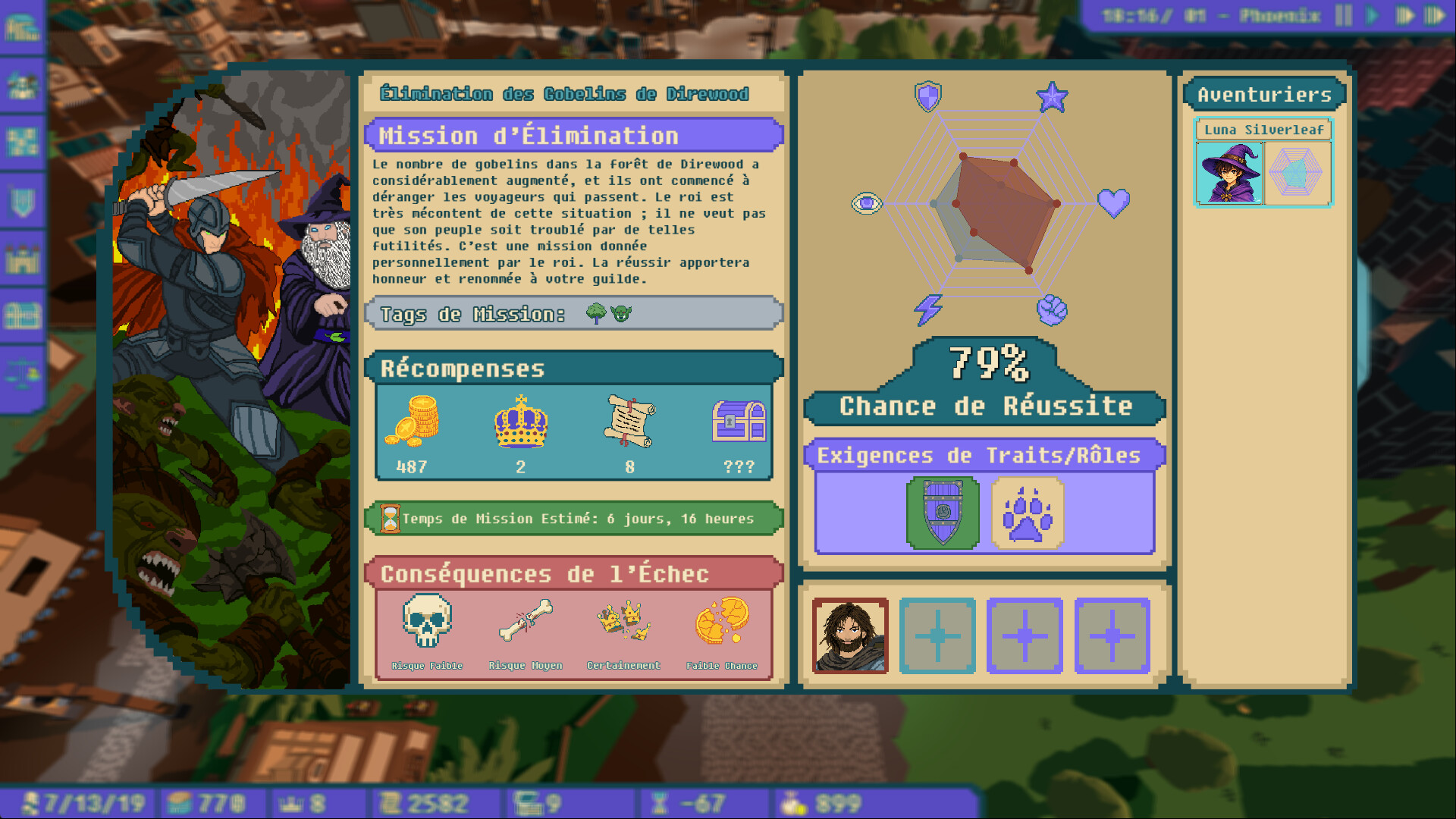 Gérez votre guilde dans un monde de fantasy vivant où chaque décision compte. Recrutez des aventuriers dans votre guilde et envoyez-les en missions dangereuses.