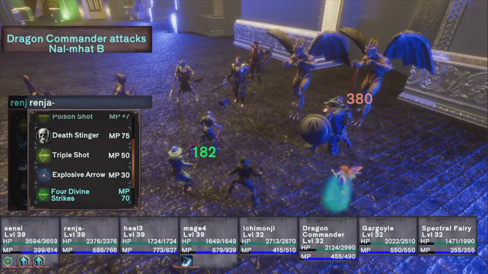 3)Your party consists of four player-controlled characters—chosen from ten distinct classes—and four AI-controlled summoned monsters, forming an eight-unit team.