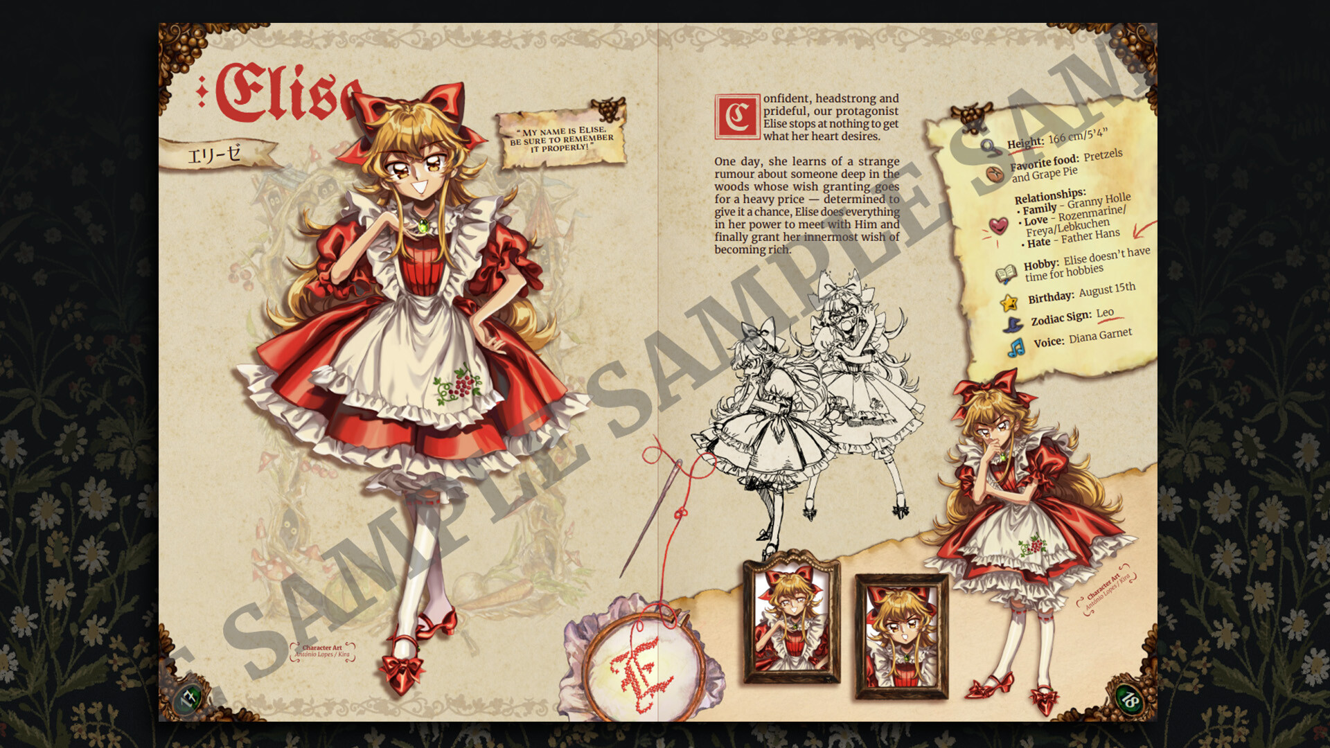 ● Plus de 600 pages de conception de personnages, d'illustrations de cartes et d'environnements, de storyboards d'animation, d'illustrations de sprites, et plus encore.