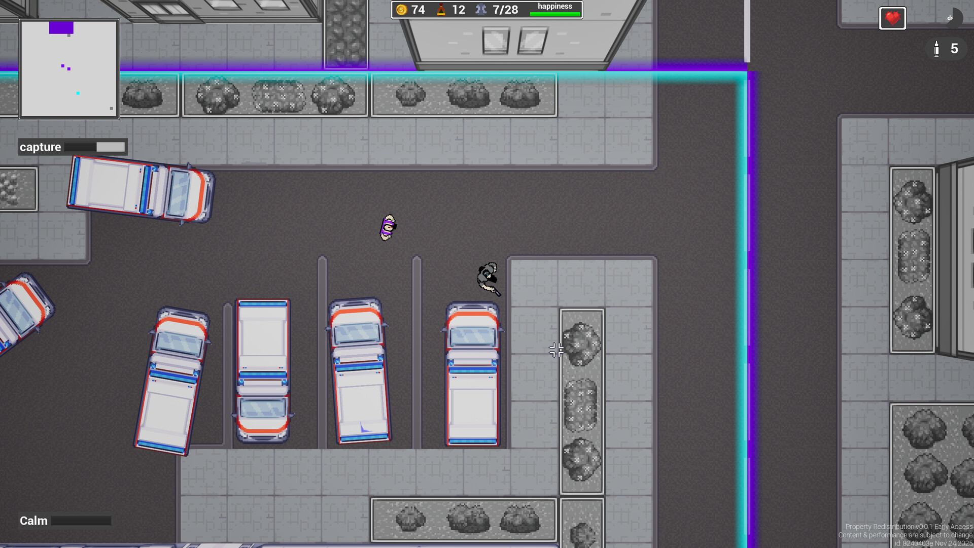 The current build includes all the core mechanics. As you progress through story missions, you'll capture city territory and take over your opponents' businesses. Currently, the game features five business types, each with two variants, and several types of uncaptureable buildings. Currently, only story missions are available. You'll experience three main characters with distinct abilities.