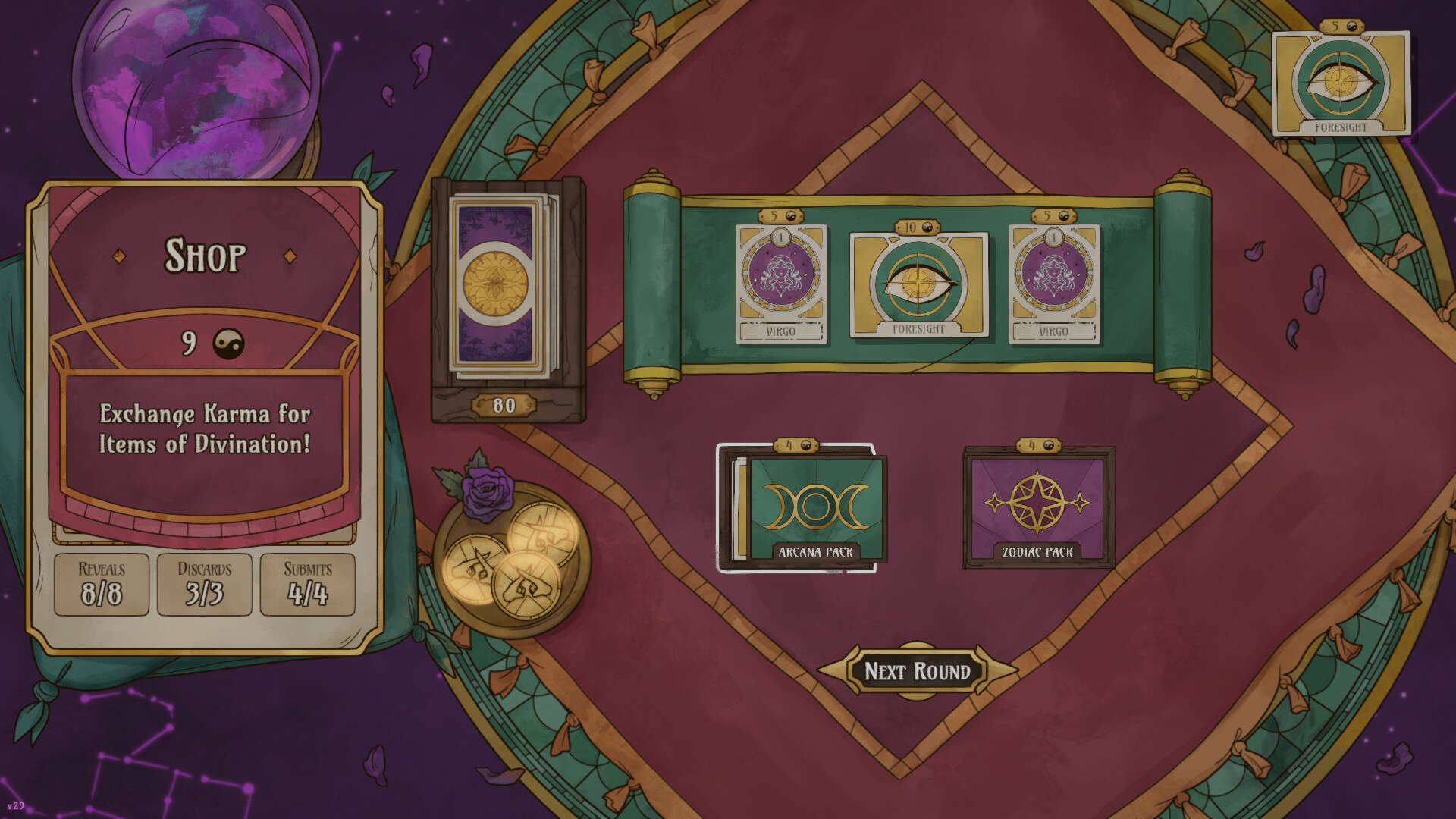 Use Karma to upgrade your deck with Zodiac and Arcana cards to earn even more points.