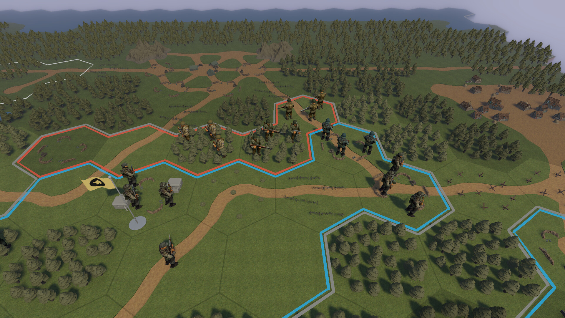Each battle takes place on carefully designed 16×16 hex maps where teams fight to control the battlefield. Capture strategic flags to earn victory points or push through enemy defenses to seize the opposing headquarters.