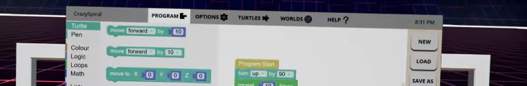 Turtle VR brings the Logo turtle into the 21st century. Use an interface similar to MIT Scratch, and Google Blockly, to program a turtle to draw your creations within various 3D worlds.