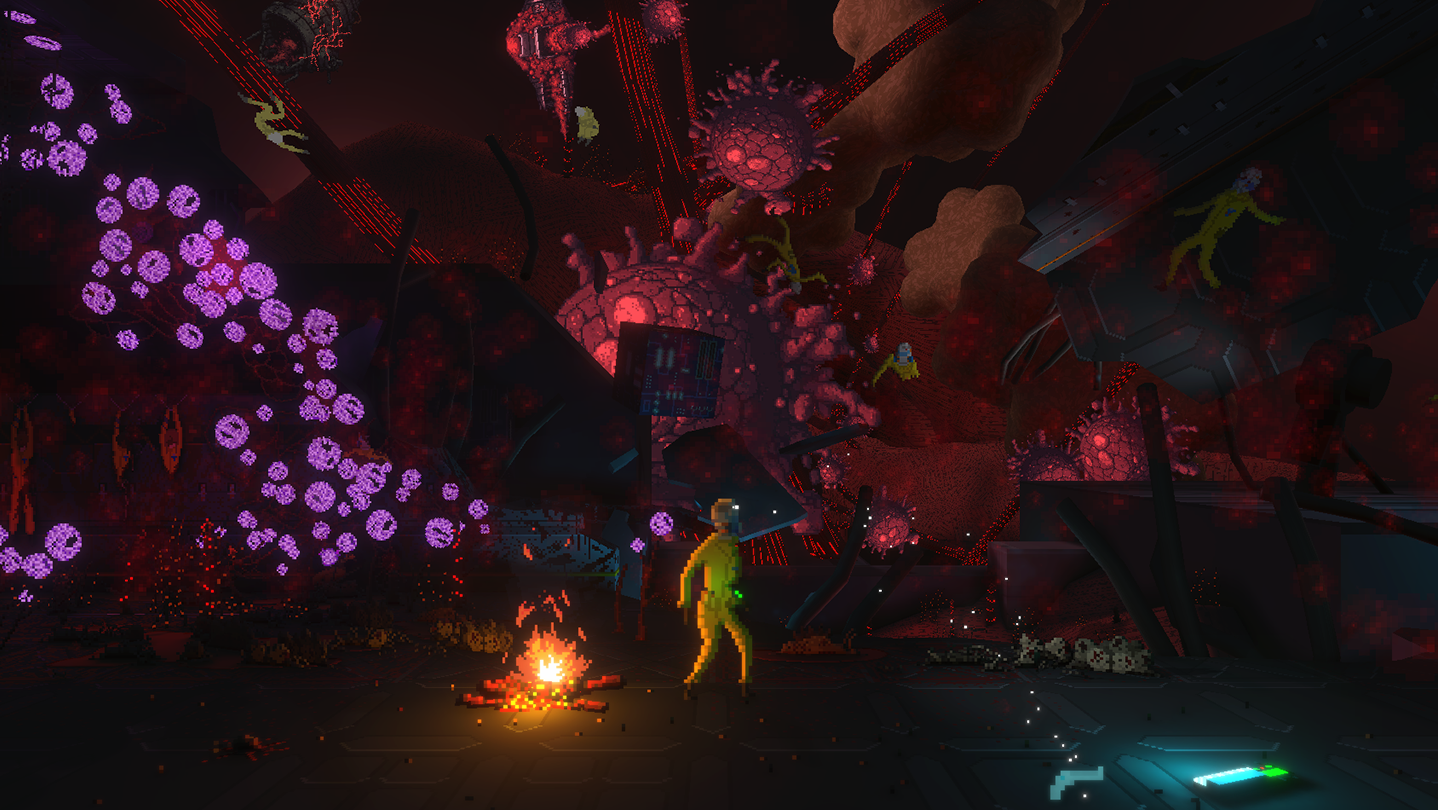 • The interface is minimal and diegetic. The art blends raw pixel visuals with a dark atmosphere. And the sound design surrounds the player in an oppressive, living experience.
