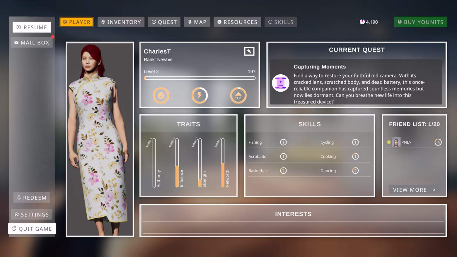 Start from scratch and grow through skills, traits, daily goals, quests, and meaningful unlocks.
