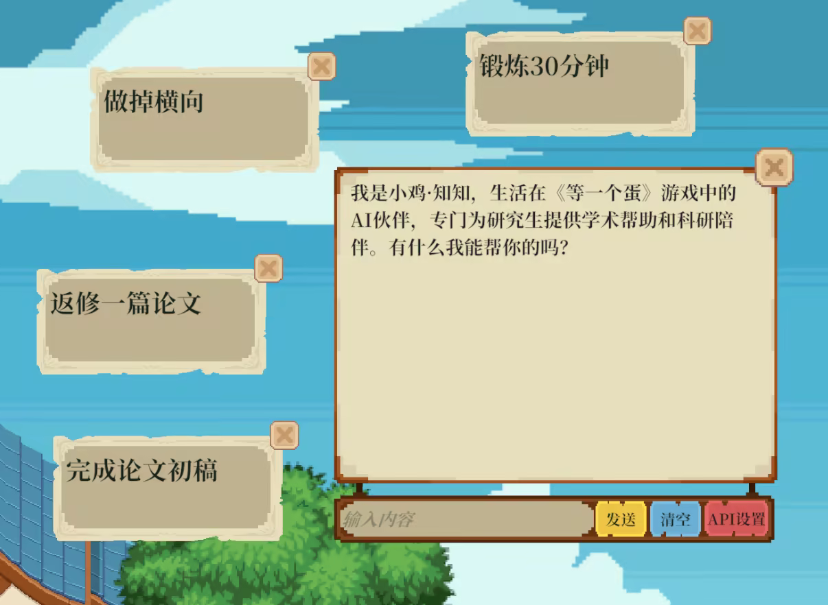 In the game, you can click the 'Chat' button to talk with our cute AI partner, 'ZhiZhi' the chicken. 'ZhiZhi' is designed to be a friendly academic companion, available to help you brainstorm ideas, answer research questions, or provide stress relief.