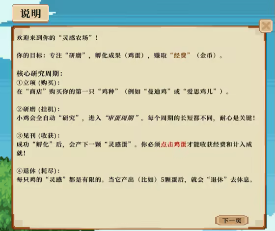 The chickens will automatically enter a long "egg review cycle" to "grind" for inspiration. If you're lucky enough, they will produce a precious "Inspiration Egg." Click the egg to harvest your "Funding," but be warned—each chicken has limited "inspiration" and will eventually "retire."