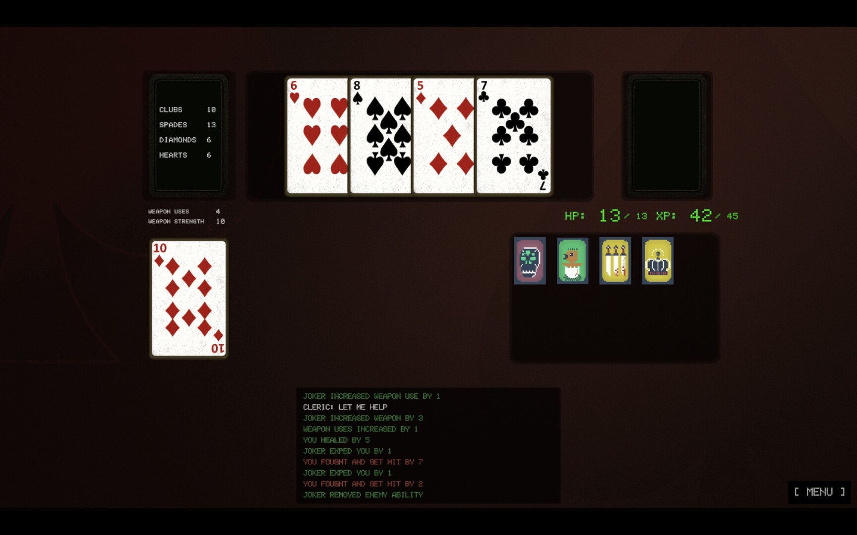 • Weapons (♦ Diamonds): Equip them to fight stronger enemies or discard to empower your current weapon.