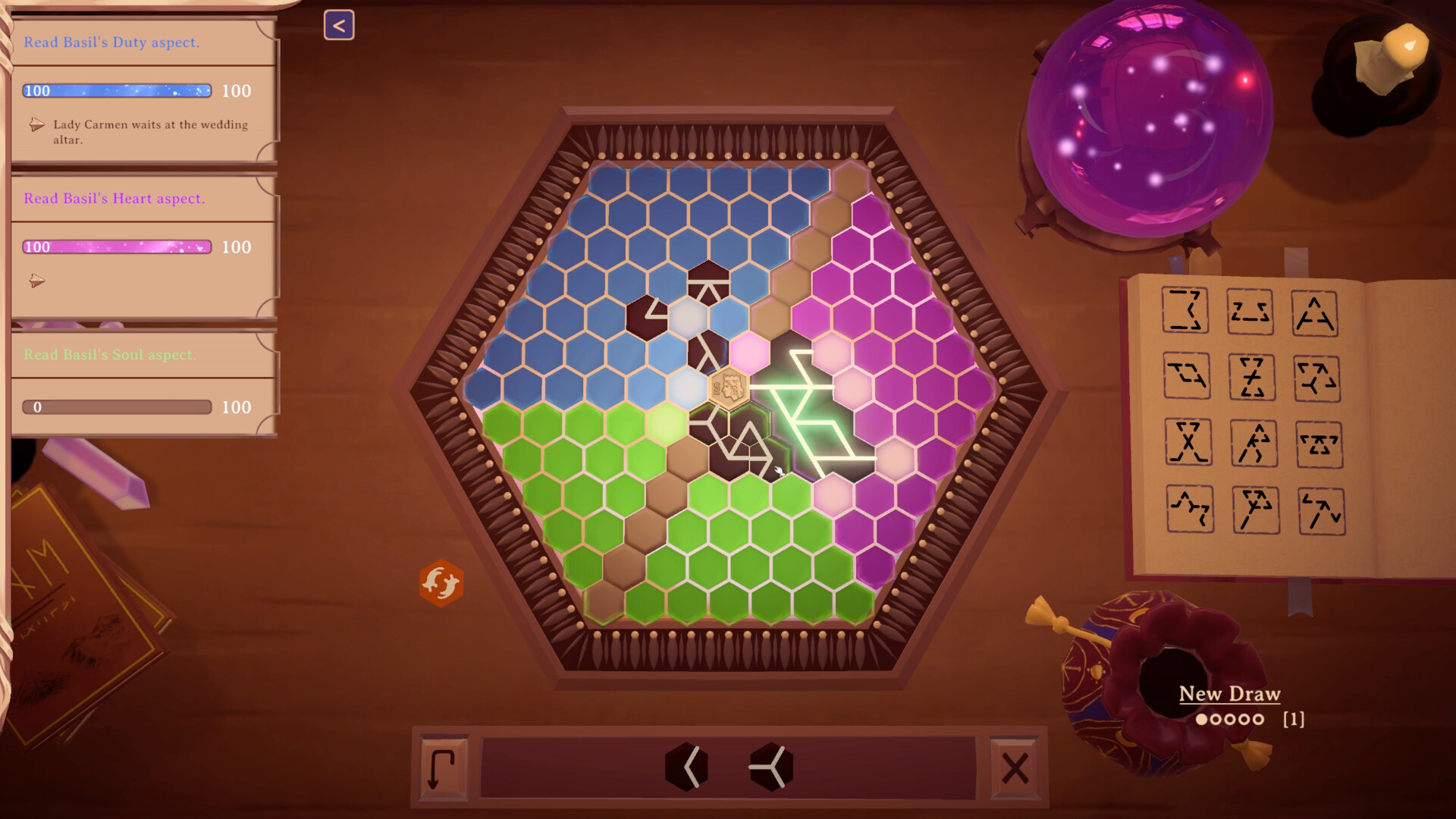 Use your fortune fragments to create magical runes on your board. These runes conduct your power to see into the future, but you have a limited number of turns and redraws to achieve your goals.